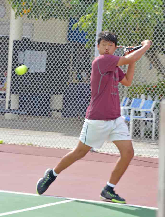 Tania Tan stretches for a backhand return to Malika Miyawaki during their women’s open singles match in the 2017 White Coconut Tennis Classic held this month at the Pacific Islands Club courts.