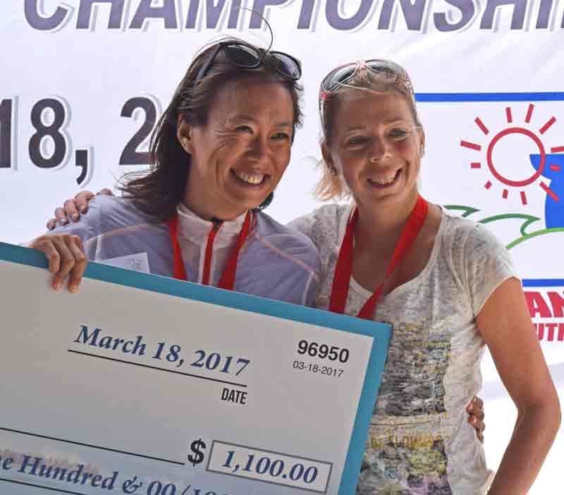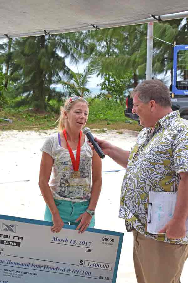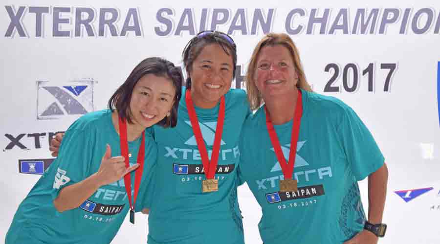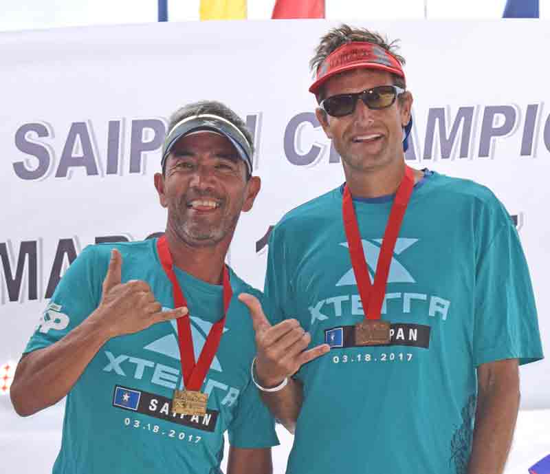 Alan Moore, second left, and G.L. Brown, both from Ada, Michigan are honored as two of the oldest competitors in last week’s 2017 XTERRA Saipan Championships during the awards banquet held at Fiesta Resort & Spa Saipan’s beach side.