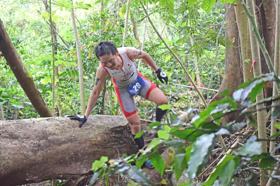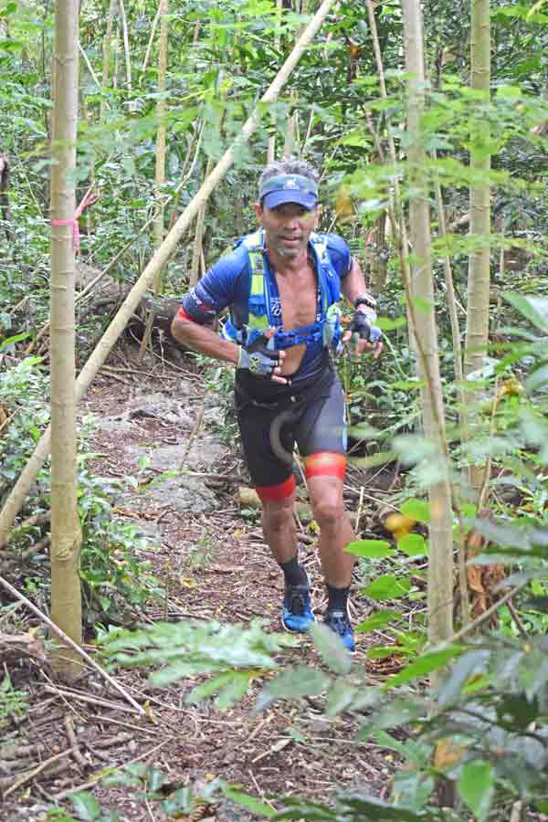 Nestor Glenn Gonzalez gets out of one of the jungles along the trail run course.