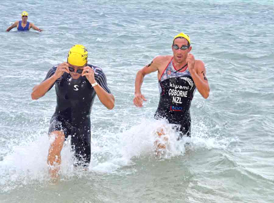 From left, Tyce Mister, Jinju Thompson, Tetsuto Sugimori, and Caleb Wang head back to the water for the last of the two-lap, 1.5-kilometer swim leg.
