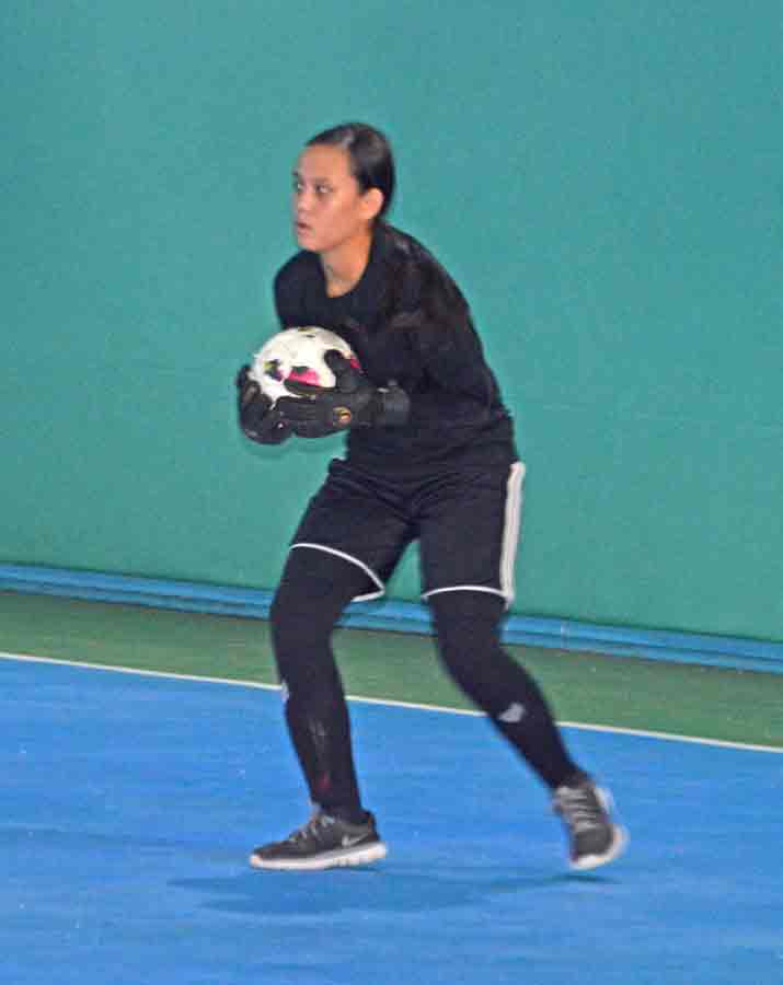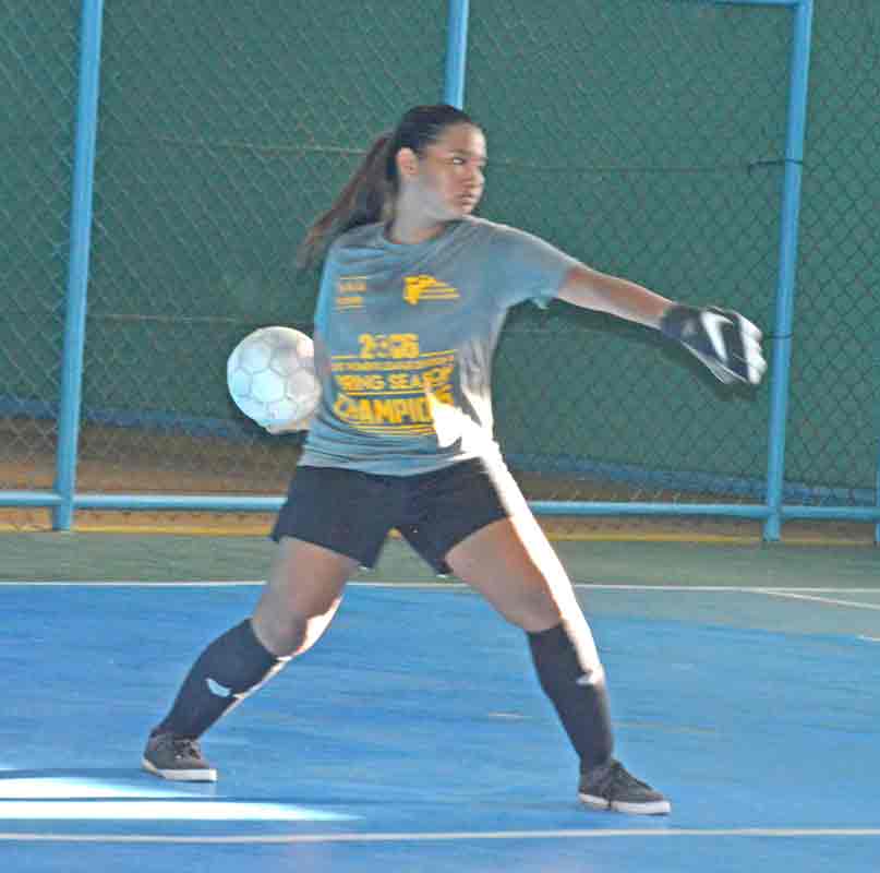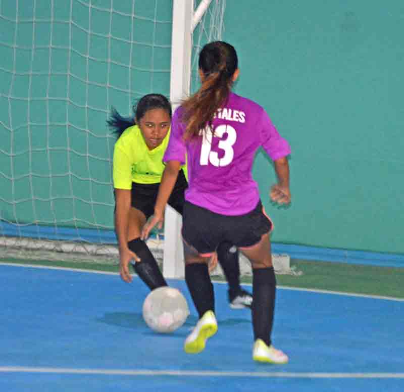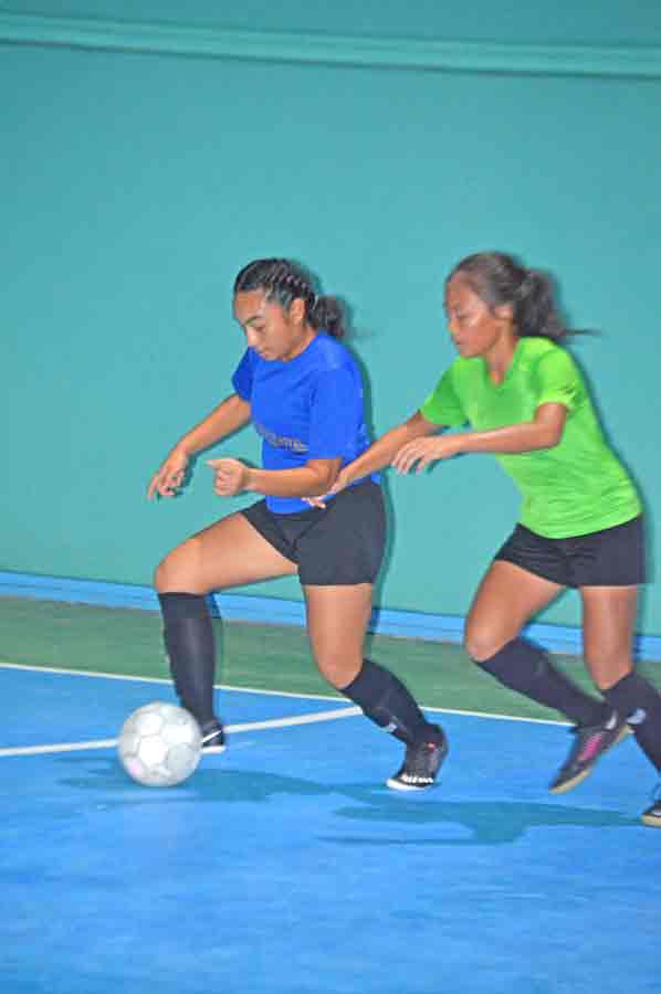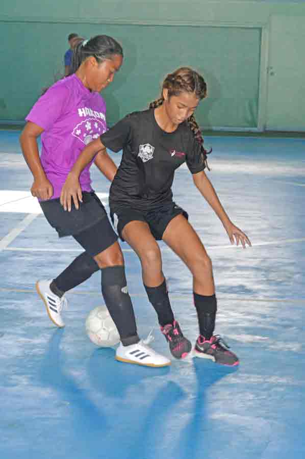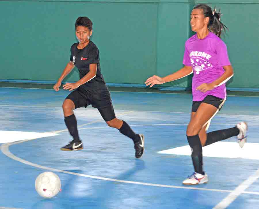 Hakone FC’s Jasmine Phan, right, and Marianas Health Armada’s Brittany Wally chase the ball during their playoff game in the girls U17 division of the Saipan Soccer School’s 2017 Youth Summer Futsal Tournament early this month at the TSL Sports Complex.