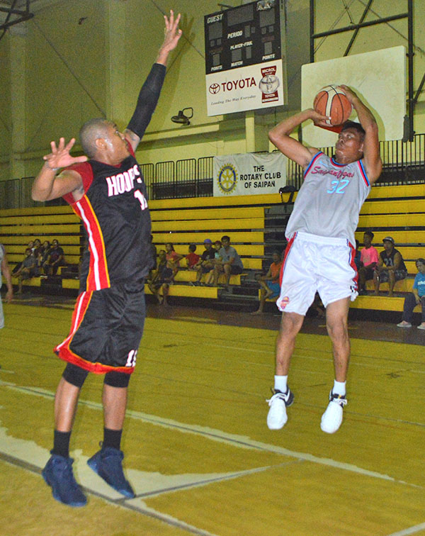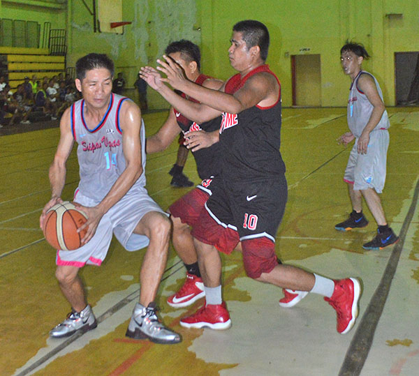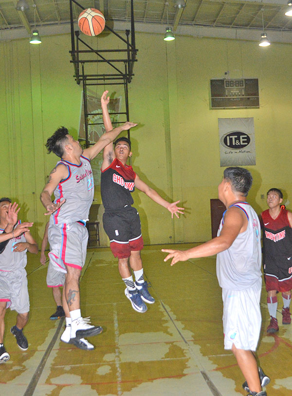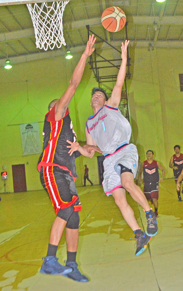 Saipan Vegas’ Leo Galarse, center, drives against Chowtime’s Mark Demonteverde, left, and Jawn Joyner, during the third quarter of their title game in the 2018 Civic Center Inter-color Basketball League held early this month at the Gilbert C. Ada Gymnasium.