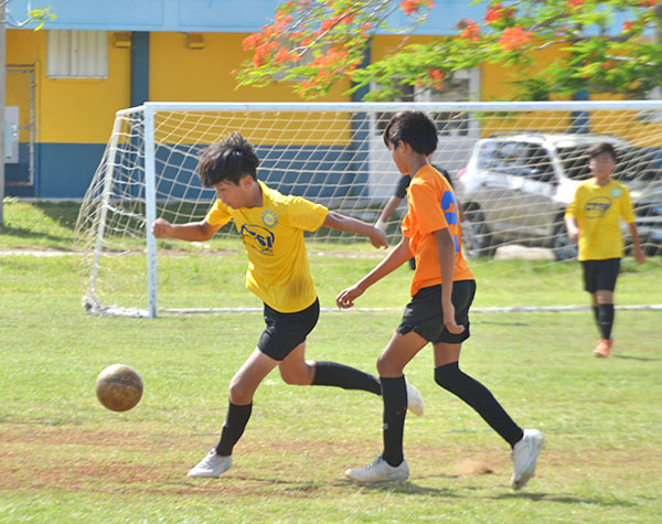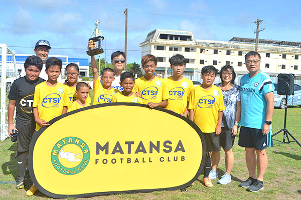 Matansa FC players and their coach are joined in the photo by NMIFA technical director Michiteru Mita, second left, NMIFA president Jerry Tan, right, and NMIFA vice president Vickie Izuka, second right.