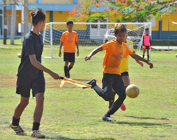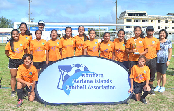 Kanoa Football Club-1 U13 Team players and coach Krizel Tuason pose for a photo with their championship trophy after beating Matansa FC, 3-0, in the finals of the 2018 FA Boys and Girls Challenge Cup held early this month at the Hopwood Middle School Field.