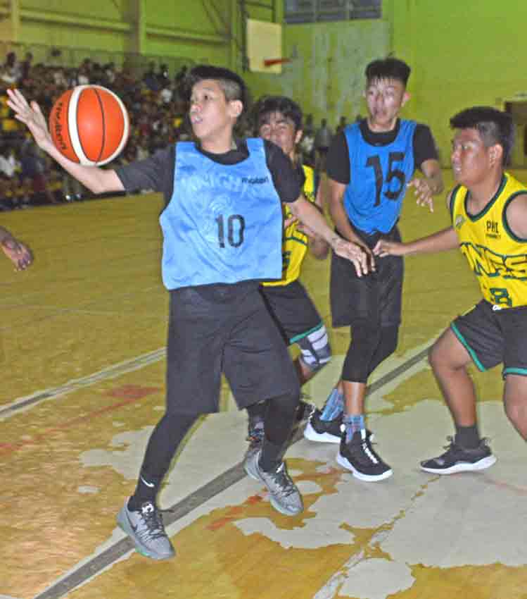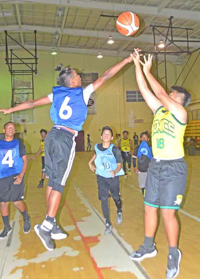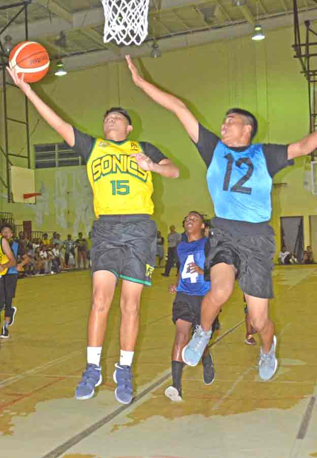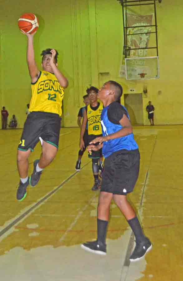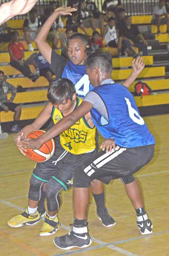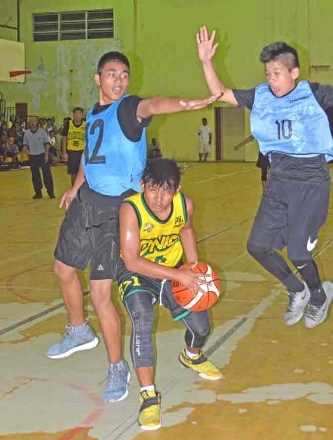 The 670 Sonics’ Raven Francisco, center, drives against two Ol’Aces Extreme defenders during their boys U15 division game in the opening day of the 2018 Frank M. Diaz Memorial Youth League early this month at the Gilbert C. Ada Gymnasium.