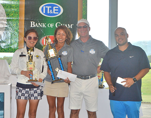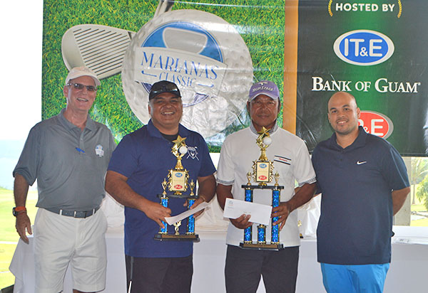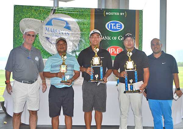 From left, 2018 Marianas Classic host and IT&E sales manager Hans Mickelson, Low Net runner-up Ron Benavente, champion Federico Flores, and IP&E’s Victor Cruz pose for a photo during the awards ceremony of the inaugural event last Saturday at the Laolao Bay Golf & Resort.