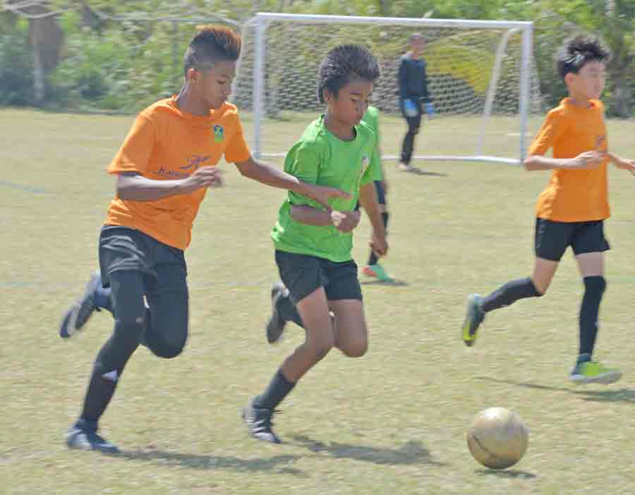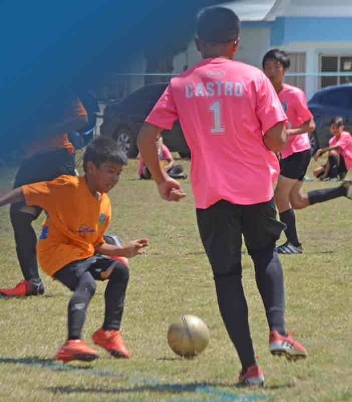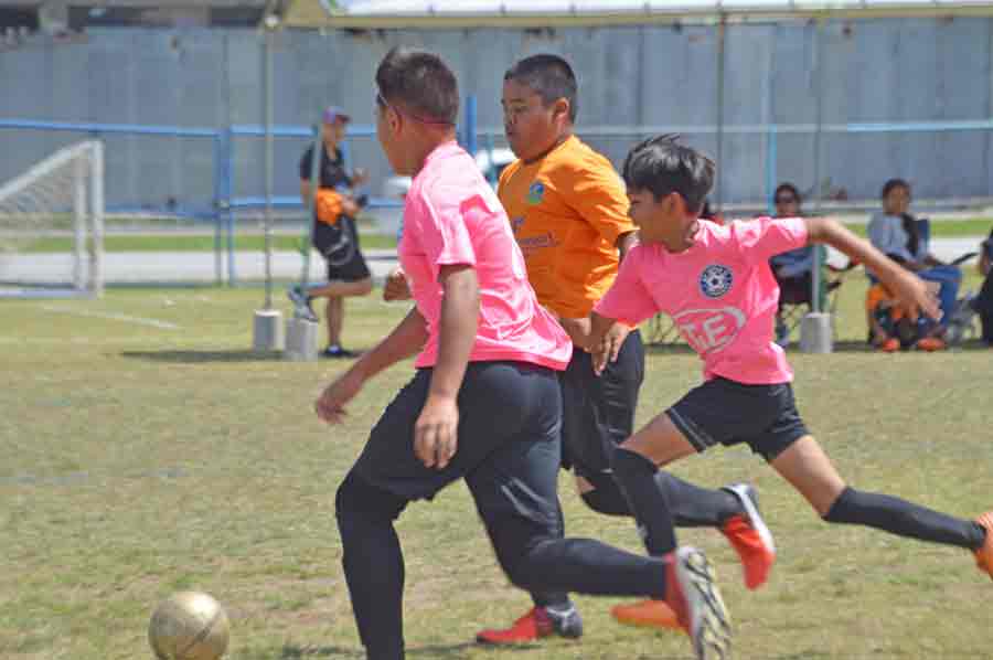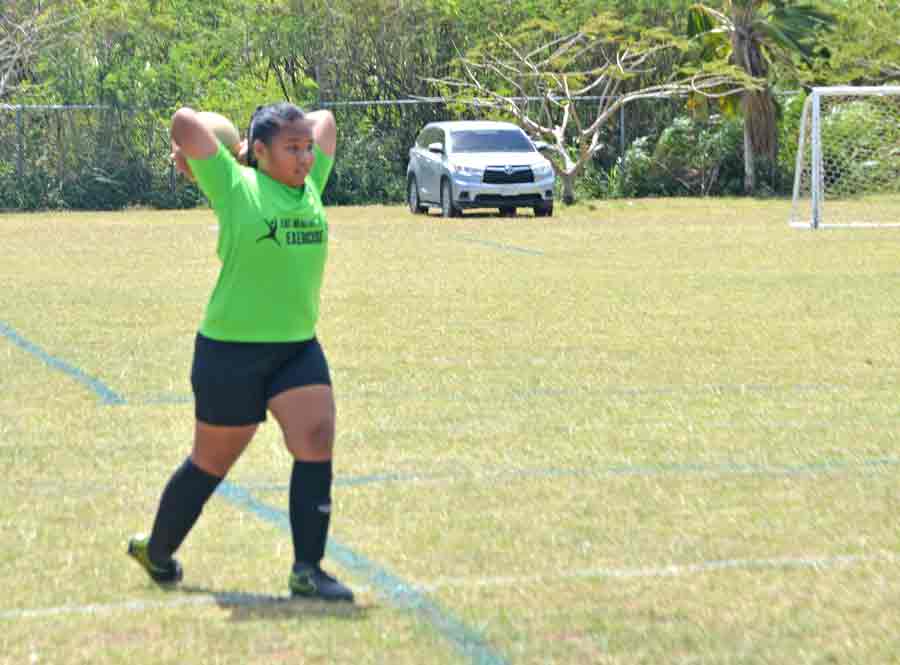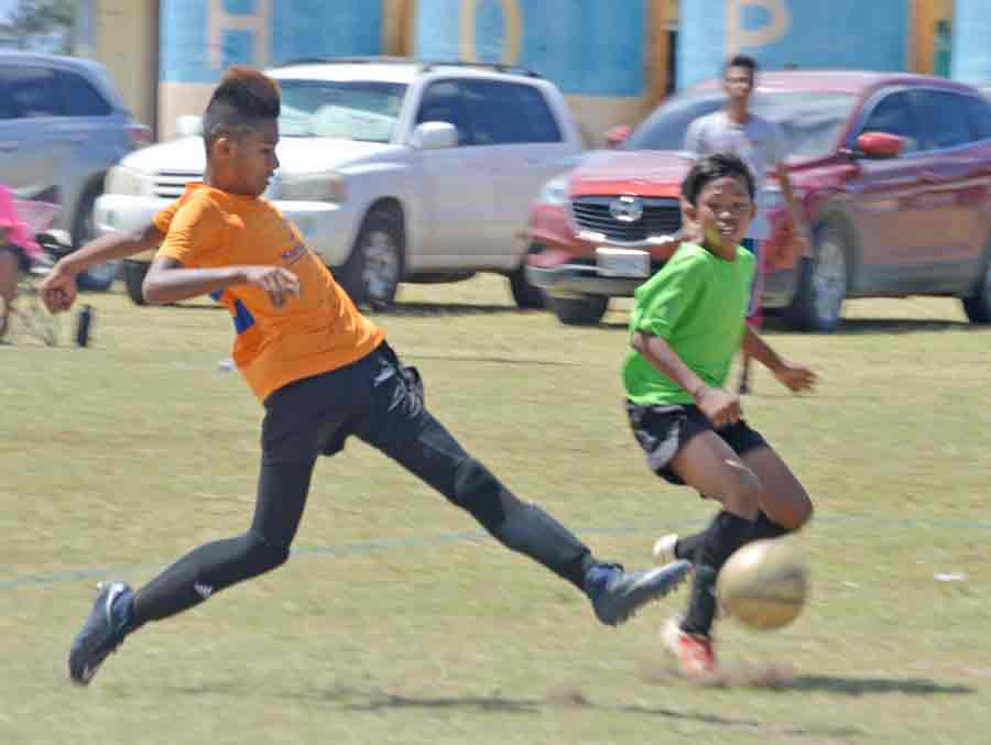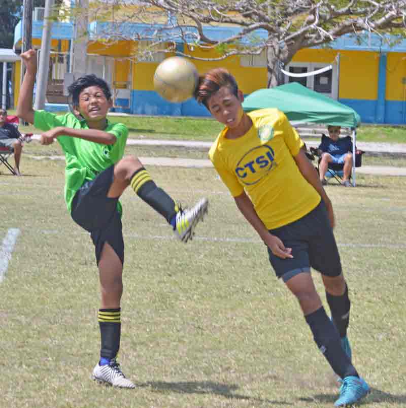 A Matansa Football Club, right, player goes for a header, while a TanHoldings FC-2 defender attempts to deflect the ball during their co-ed U13 division game in the 2018 NMIFA Spring Youth League at the Hopwood Middle School Field.