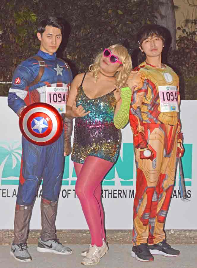 A Marianas Visitors Authority staff, center, poses with runners dressed in Captain America, left, and Ironman costumes while waiting for the start of last Saturday’s 2018 Saipan Marathon. (Roselyn B. Monroyo)