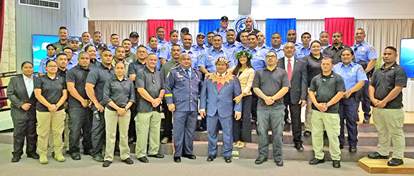 Gov. Ralph DLG Torres, center, and first lady Diann Torres join Department of Public Safety personnel led by Commissioner Robert Guerrero after last Friday’s State of the Commonwealth Address at the Gov. Pedro P. Tenorio Multi-Purpose Center in Susupe.