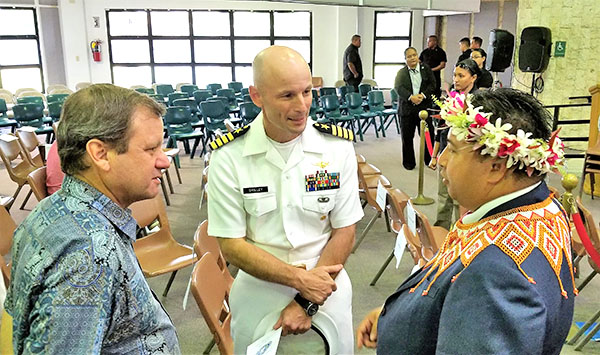 Gov. Ralph DLG Torres, right, talks with CNMI Joint Region Marianas Coordination Office director Randy Sablan, left, and Capt. Hans Sholley, the chief of staff of CJRM Commander Rear Adm. Shoshana Chatfield.