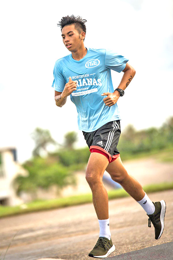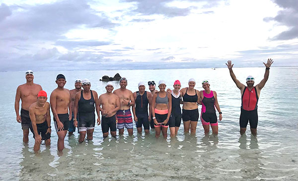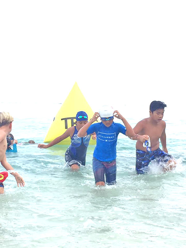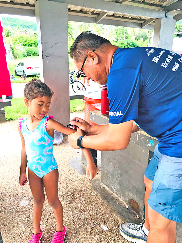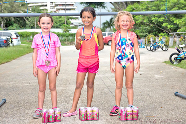 From left, third placer Lovel Spaeth, runner-up Leilani Ruszala, and champion Scarlett Burrell pose with their medals and prizes during the awards ceremony for the 2019 IT&E Taga Kids & Sprints Triathlon last Sunday at the Paupau Beach. (Ponce Corotan)