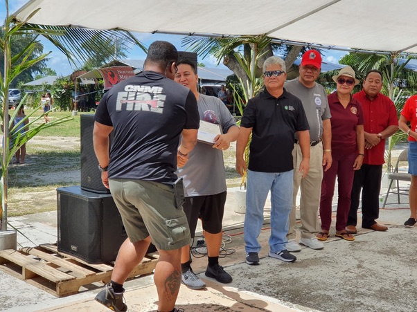 Juan Camacho of the Department of Fire & Emergency Management Services shakes Gov. Ralph DLG Torres’ hand as he receives his award as DFEMS’ Employee of the Year during last Saturday’s Labor Day celebration at the Garapan Fishing Base.