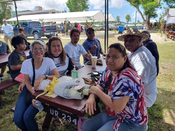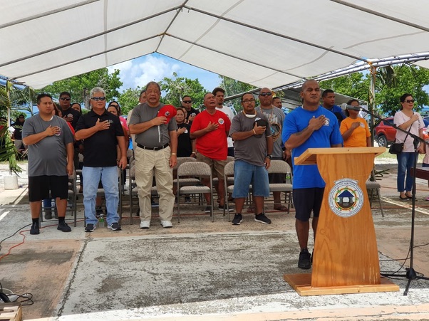 Gov. Ralph DLG Torres, Lt. Gov. Arnold I. Palacios, and Saipan Mayor David M. Apatang pose for a photo with members and spectators of the Labor Day celebration last Saturday at the Garapan Fishing Base.