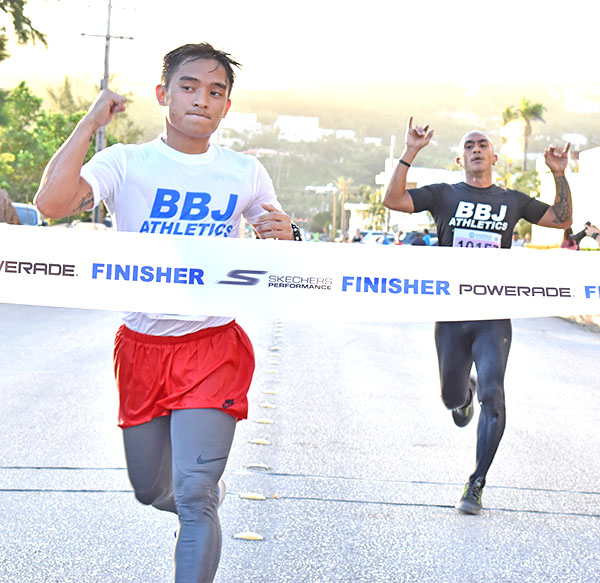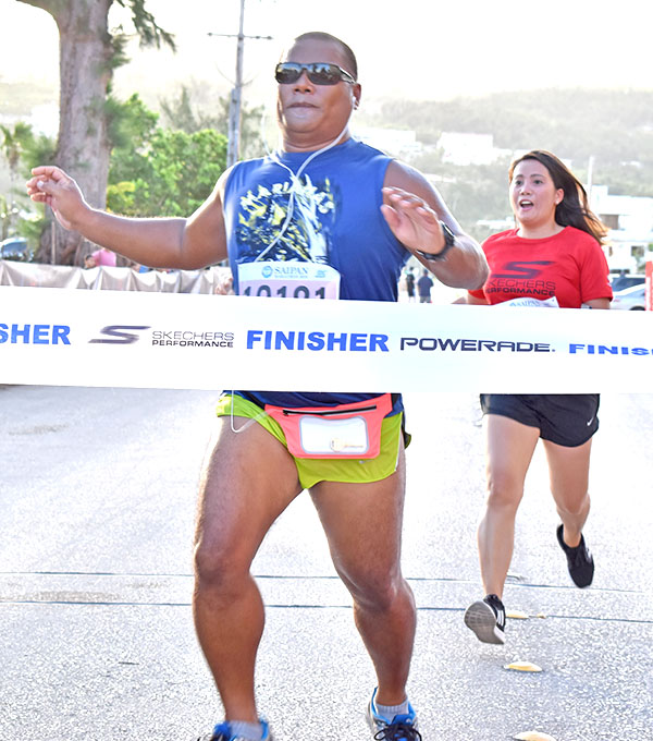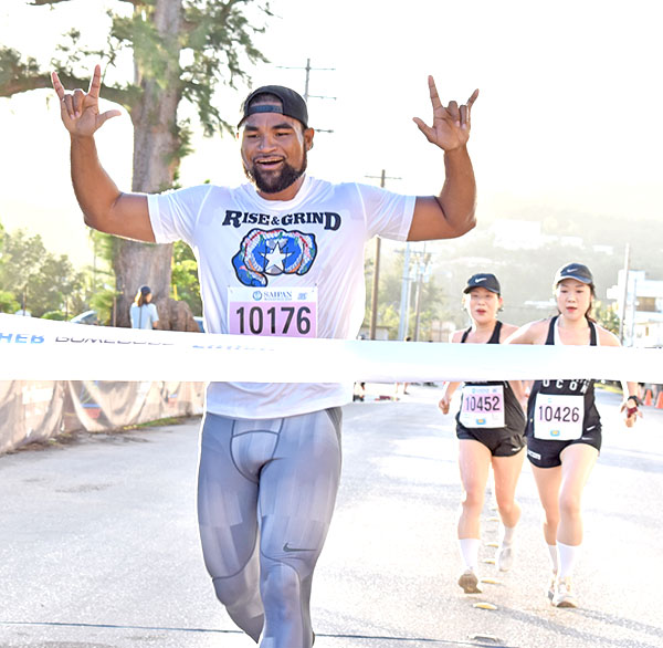 The CNMI’s MMA warrior Kelvin “The Big Hit” Fitial celebrates his finish in the 10K event of the 2019 Saipan Marathon held early this month.