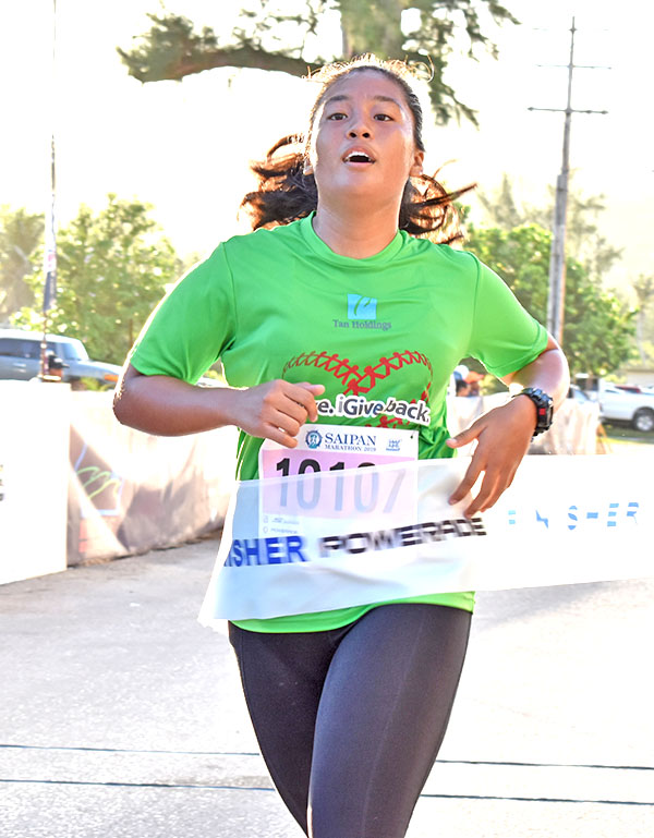Mia Carreon cuts the tape en route to a first place finish in the girls 16 to 19 age group’s 10K event.