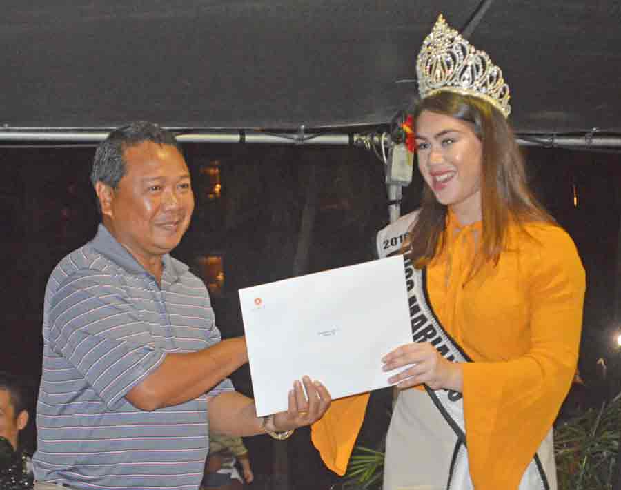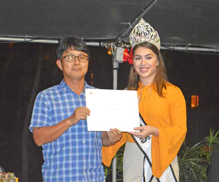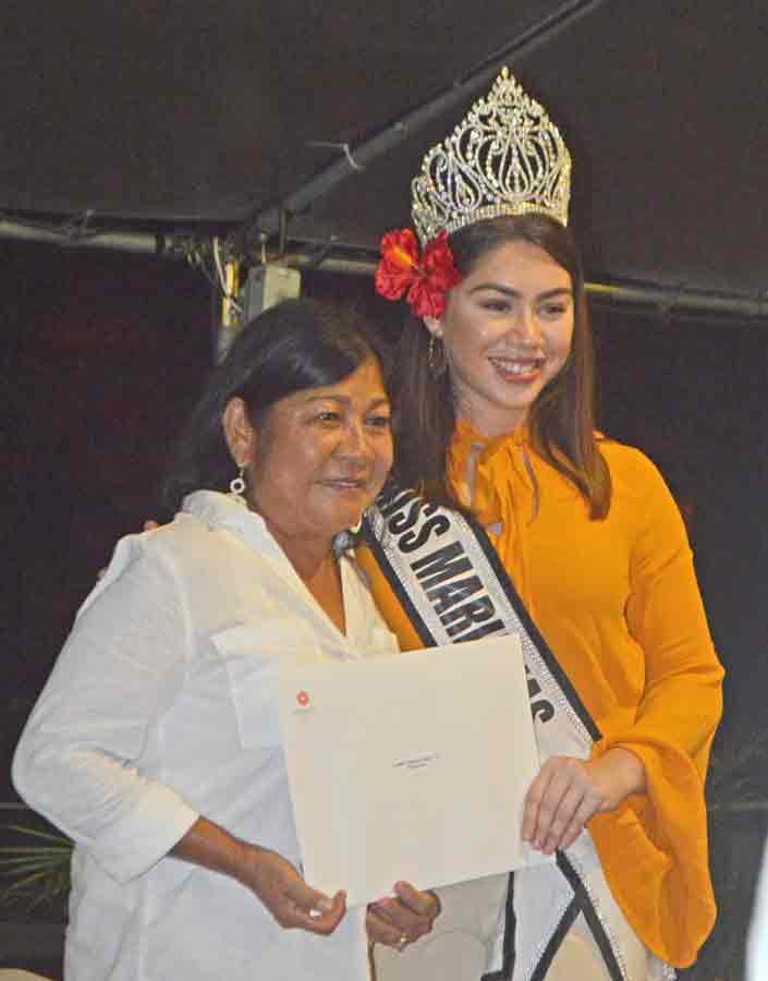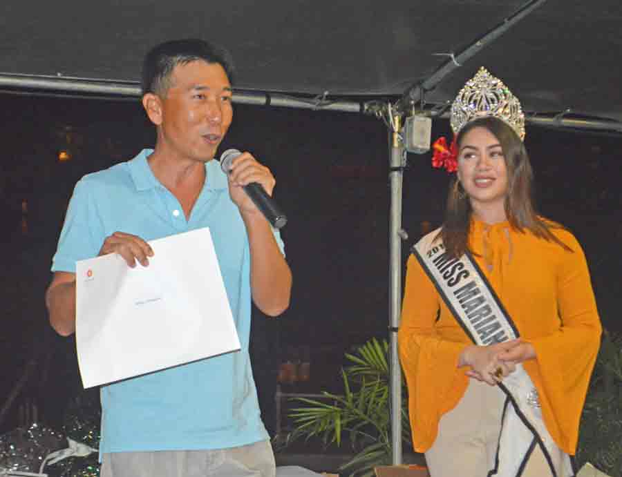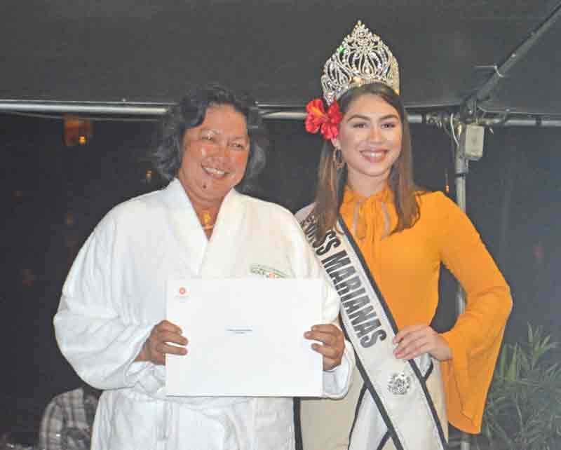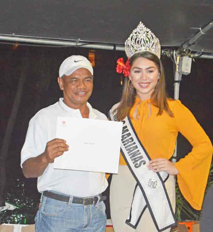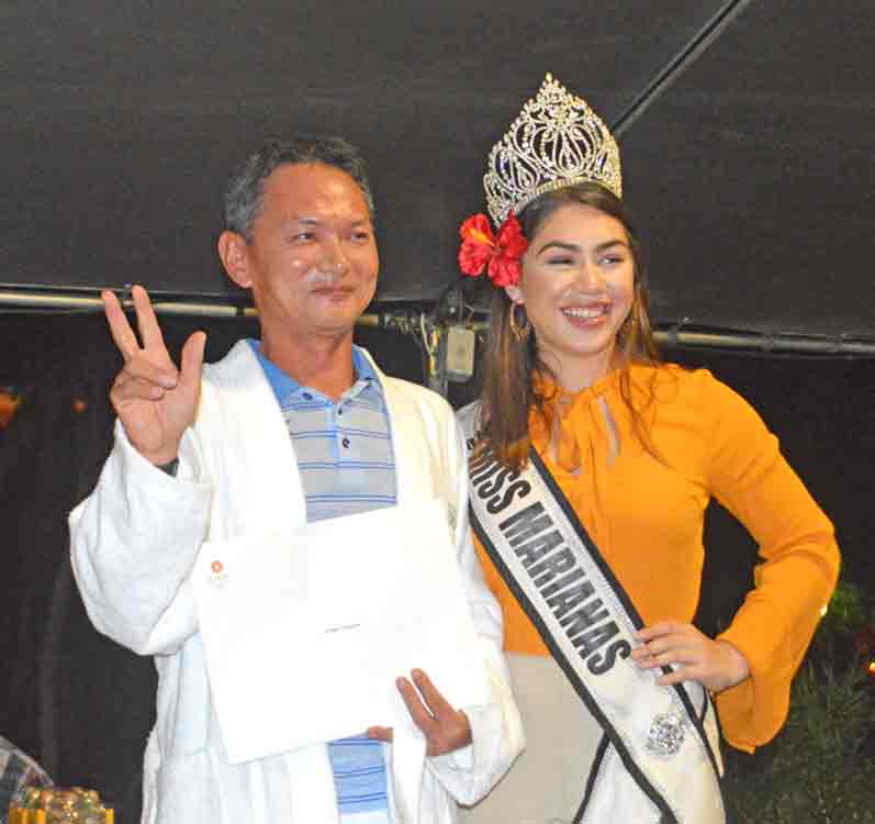 Lorraine Babauta wears the Hyatt Regency robe after getting the first place honors in the Ladies Flight of the 21st Hyatt Regency Saipan Charity Golf Classic during the awards ceremony last Saturday at the hotel’s pool side. Also in the photo is Miss Marianas Peachy Quitugua, who handed the awards to the winners.