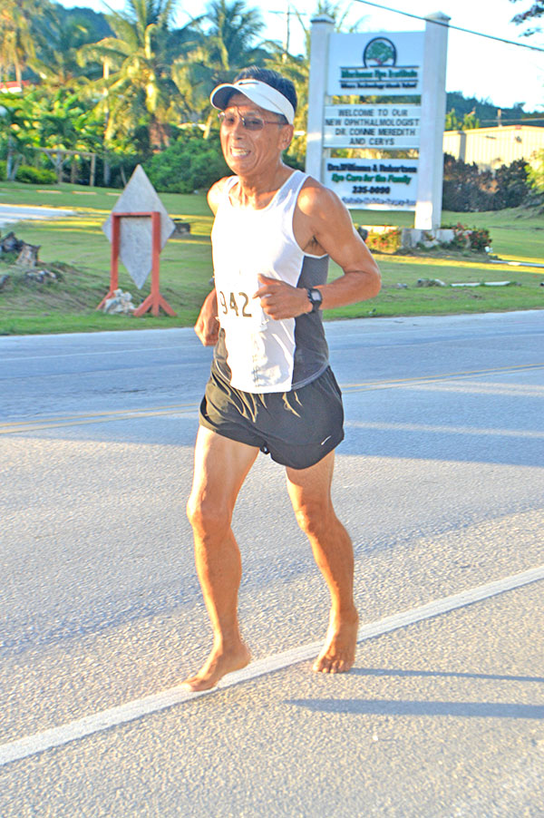 Barefoot runner Chang Whan Jang makes his way back to the start/finish line.