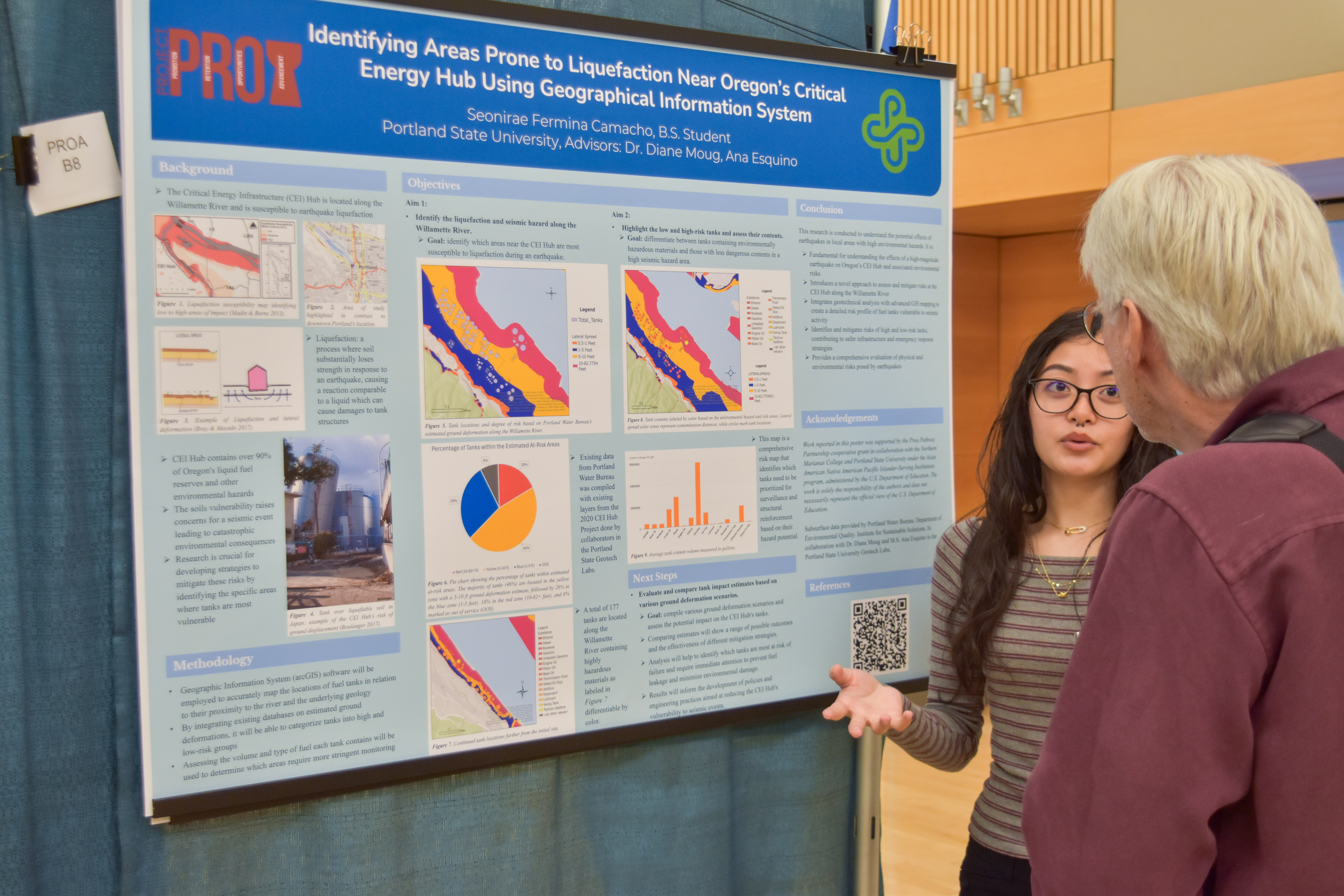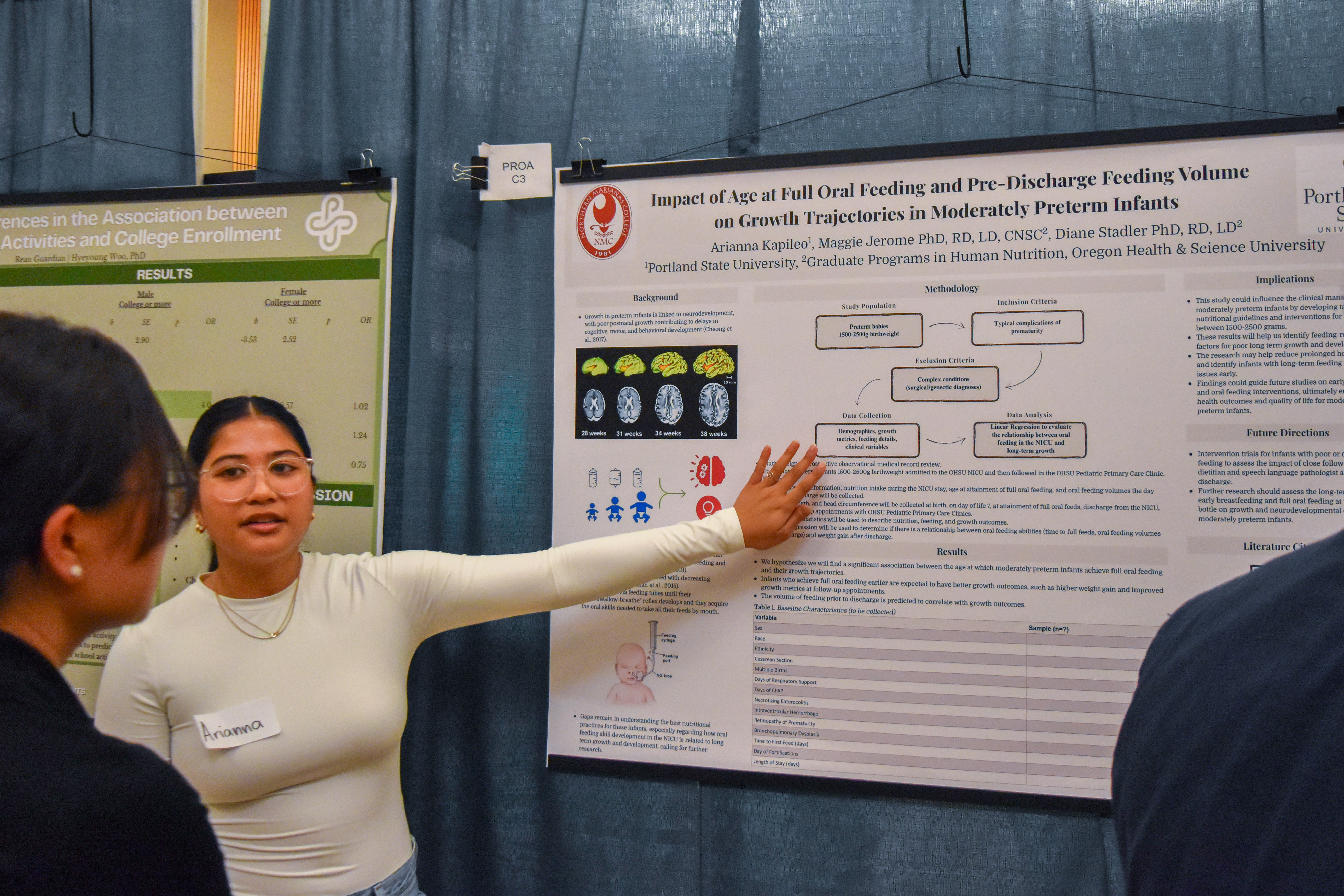 Arianna Kapileo speaks with a participant about her research findings from her time in the Graduate Programs in Human Nutrition at Oregon Health and Science University (Proa Pathways Scholar: Cohort 2A).