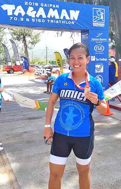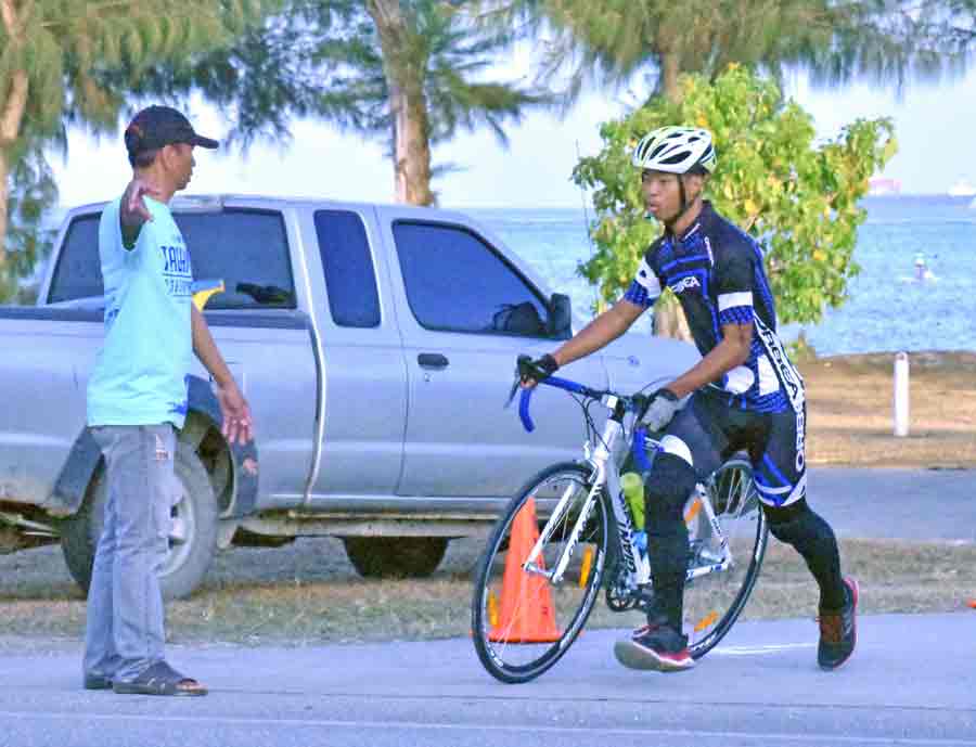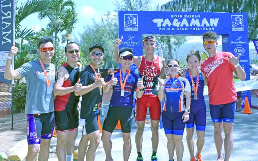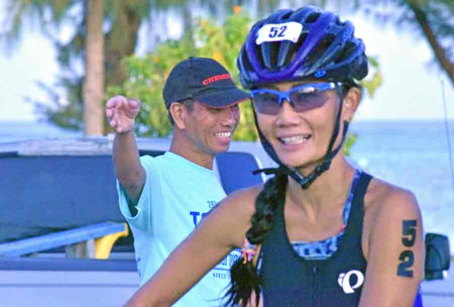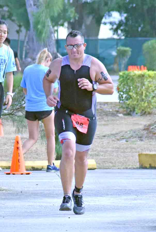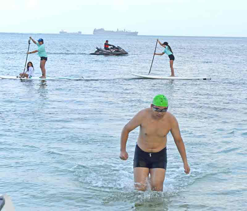 A Team Agape Courageous member emerges out of the water after completing the 1.9-kilometer swim from Kanoa Resort to Kilili Beach during last Saturday’s 29th Tagaman Triathlon.