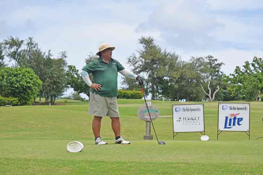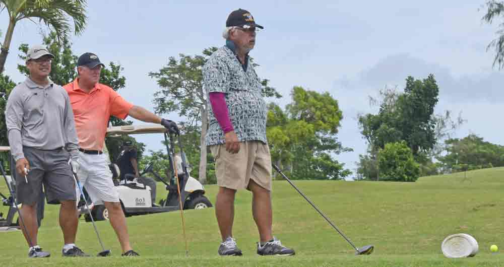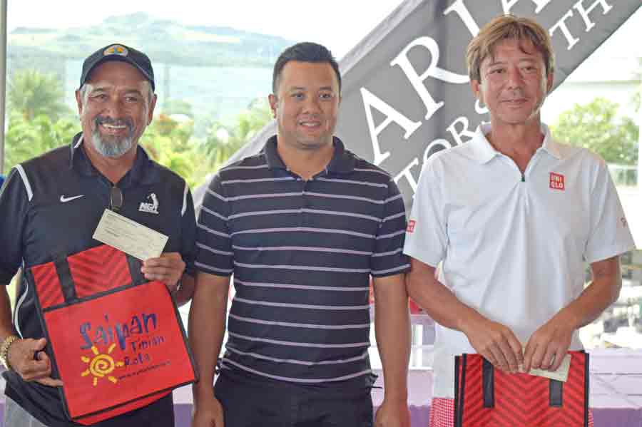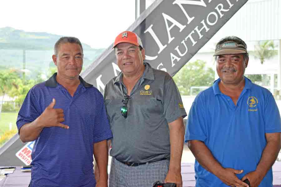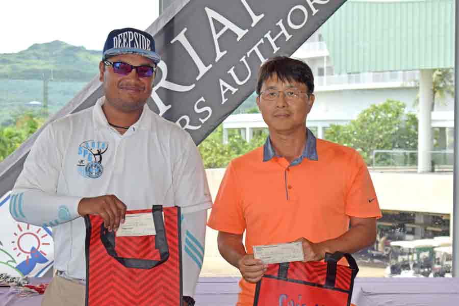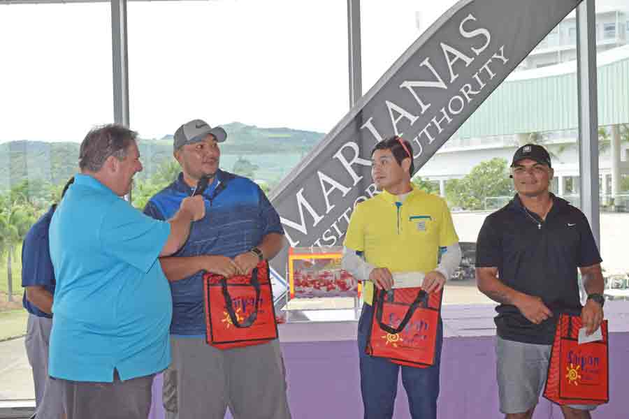 Glenn Policare, from left, interviews C Flight champion Dave Apatang as the representative of runner-up Tommy Kim and third placer Paul Manglona look on.
