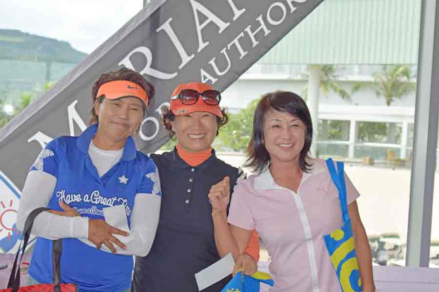 From left, Ladies division champion Chang Hee Yoo, second placer Gil An Yoon, and third finisher Shiori Onue are all smiles after getting their prizes.