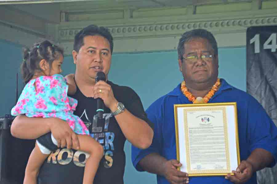 Gov. Ralph DLG Torres, left, addresses the participants during the opening ceremony, while Saipan and Northern Islands Municipal Council member Diego Kaipat looks on and waits for the presentation of a resolution to the late Timothy Lee Salas Wesley Jr. (Roselyn B. Monroyo)