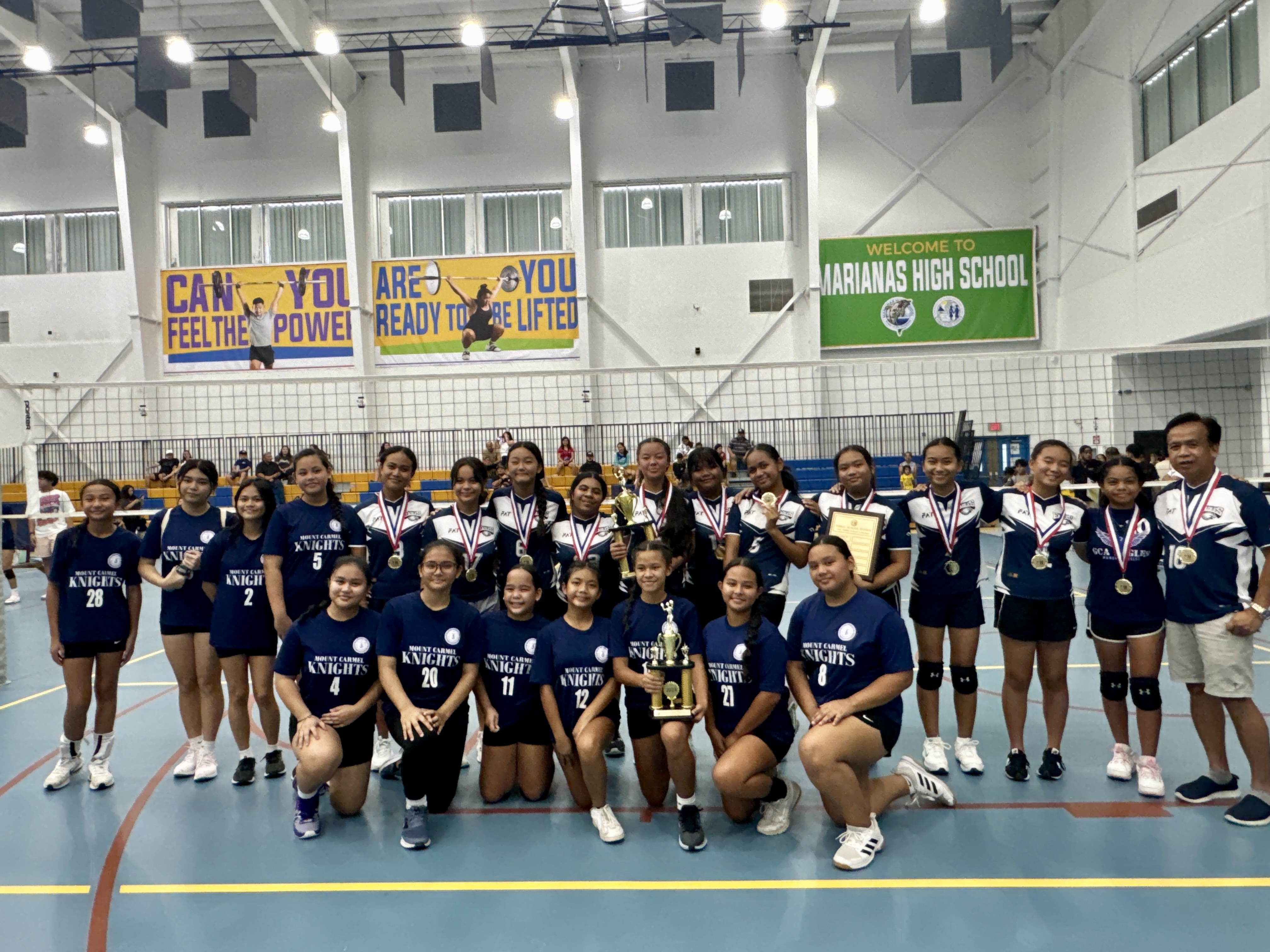 Three-time champions Grace Christian Academy Lady Eagles pose with their trophy and coaches Cesar Libut, far right, and Katriel Saures, standing fifth from left, along with second place Mount Carmel School Lady Knights during the awarding of the NMIVA-PSS Interscholastic Girls Middle School Volleyball League 2023-2024 last Saturday at the Marianas High School Gymnasium.
