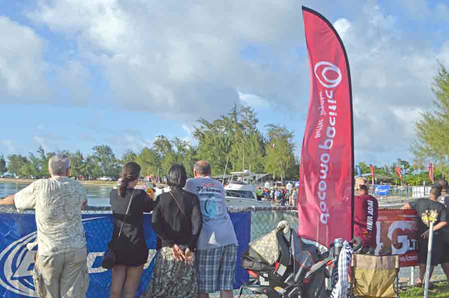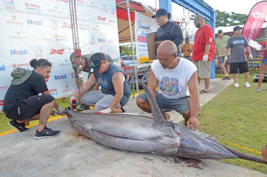 Organizers and volunteers team up in measuring the catch of Aquaholics during the 33rd Saipan International Fishing Tournament held over the weekend. The marlin later tipped the scales at 344.50 lbs, handing Aquaholics the top honors in the billfish category.
