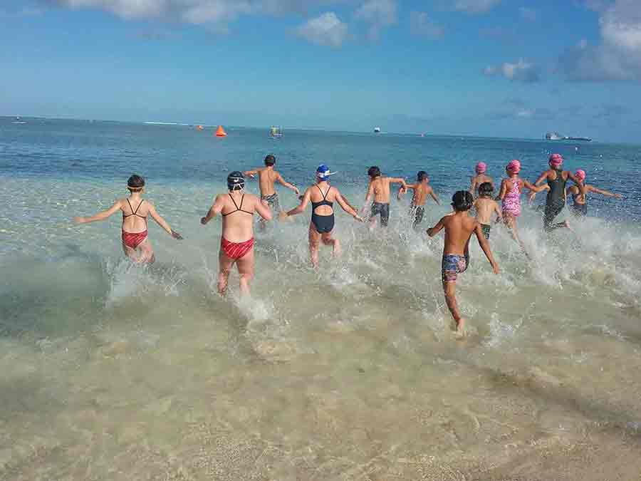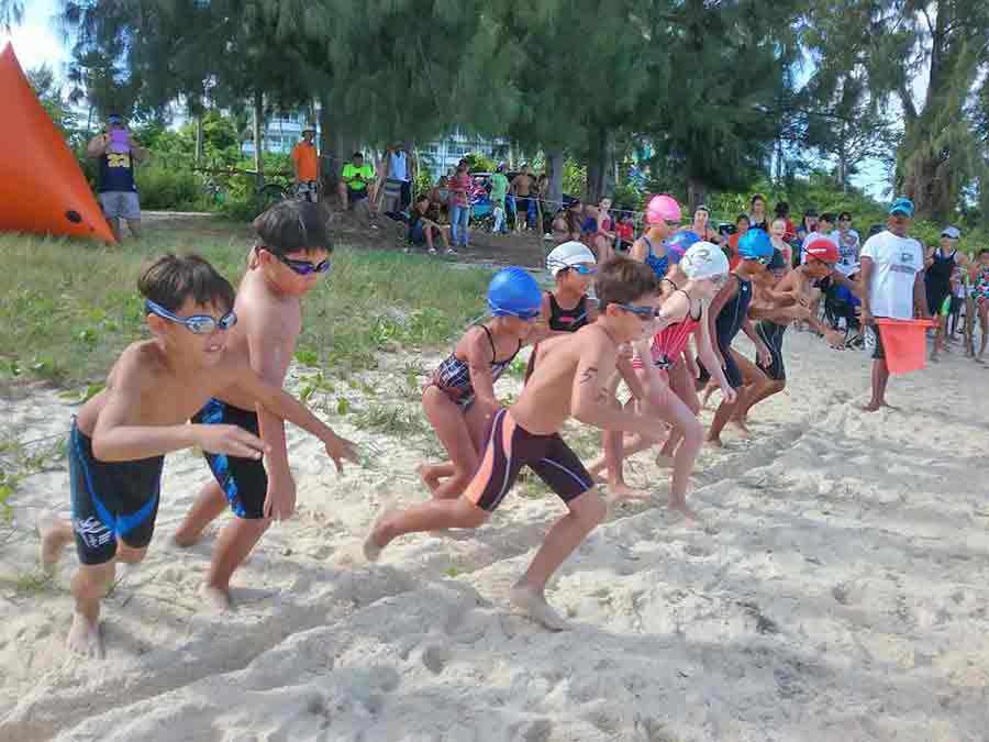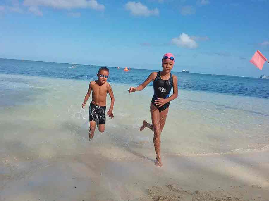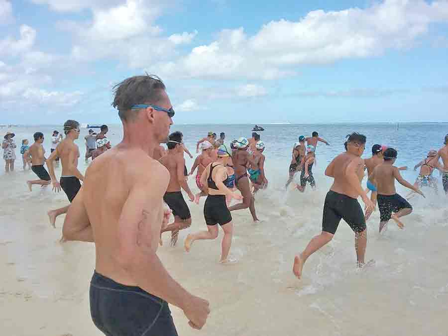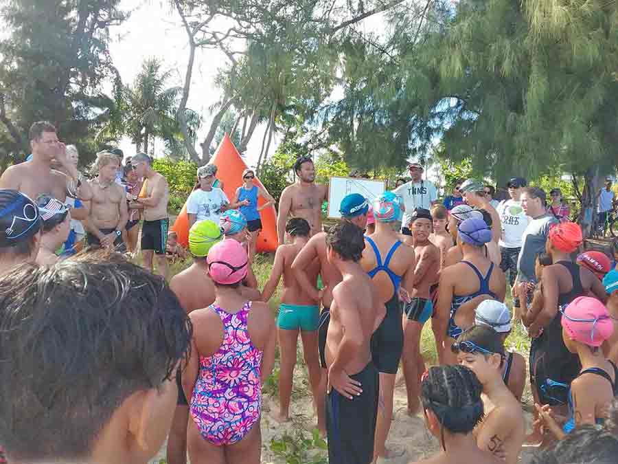 Saipan Swim Club head coach Jacoby Winkfield briefs swimmers on the course in last Sunday’s 38th Annual SSC Ocean Swim held in the waters near Naked Fish in Susupe.