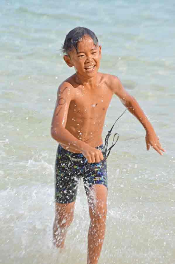 Tsunami Saipan’s Aasish Dangol runs out of the water during the one-kilometer race for the 9 to 10 age group division in the 39th Annual Saipan Swim Club Ocean Swim held last March 24 in the waters near Naked Fish in Susupe.