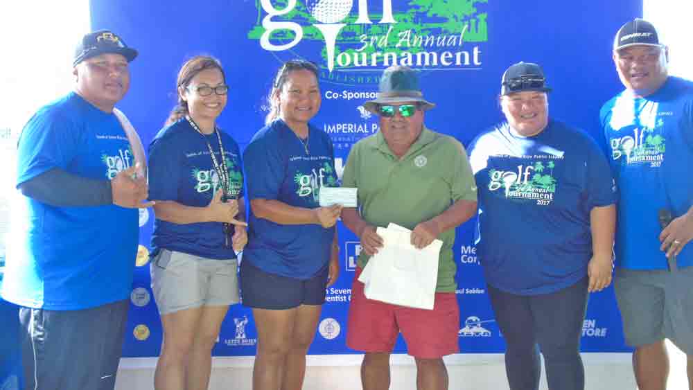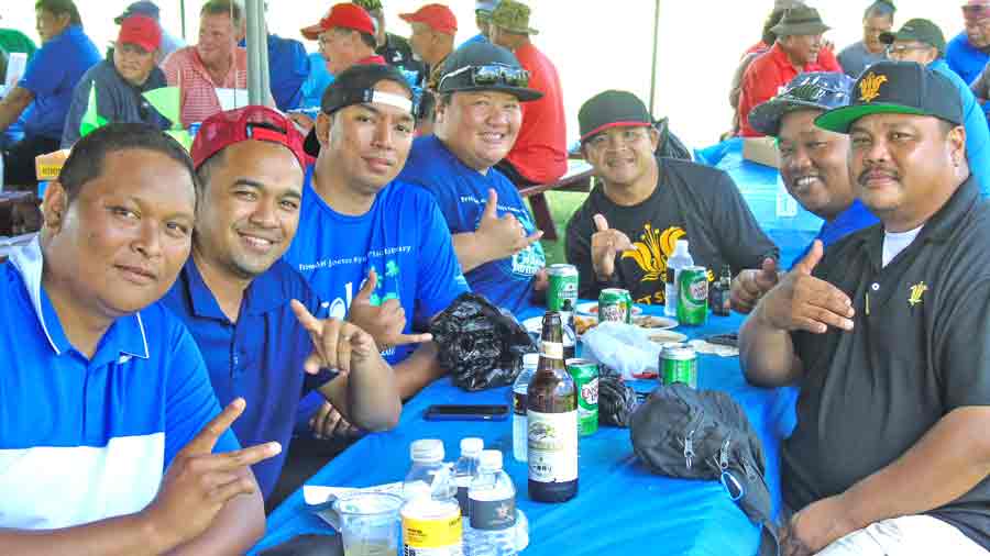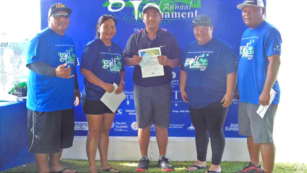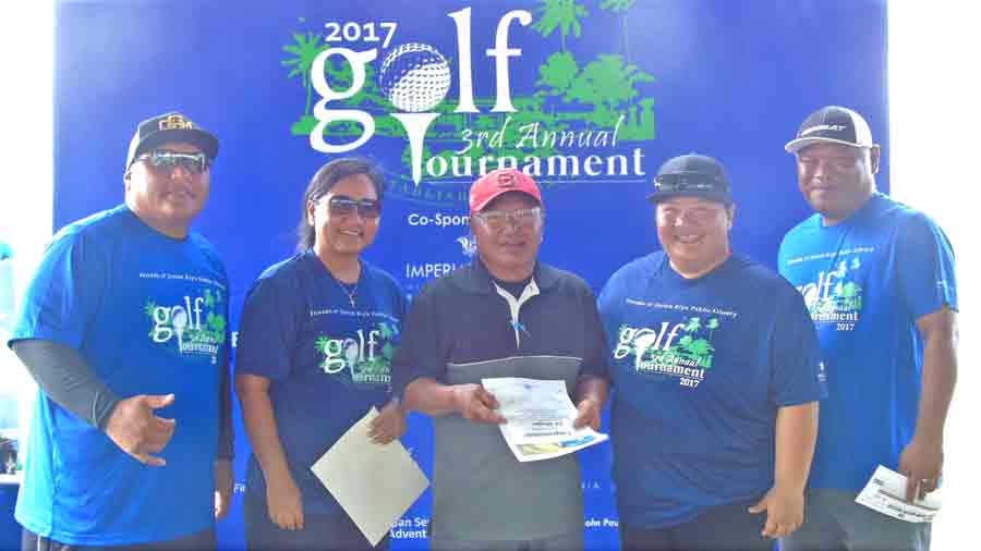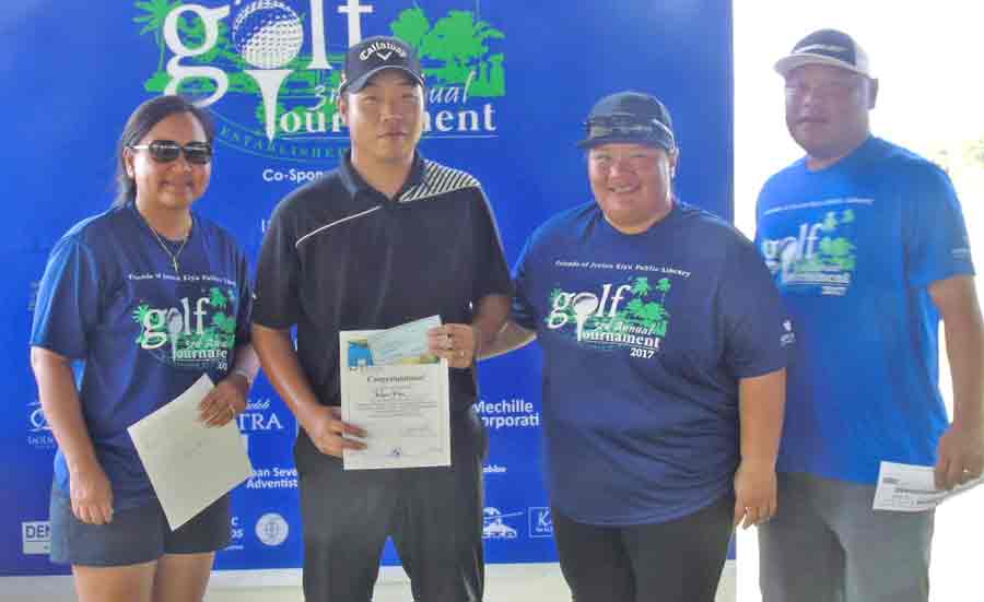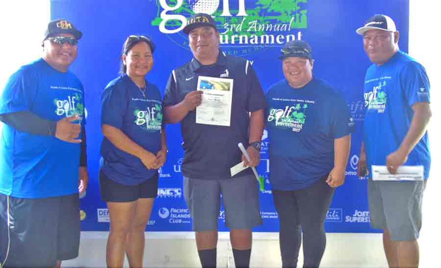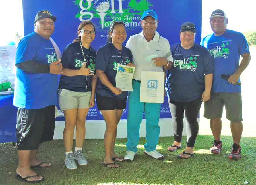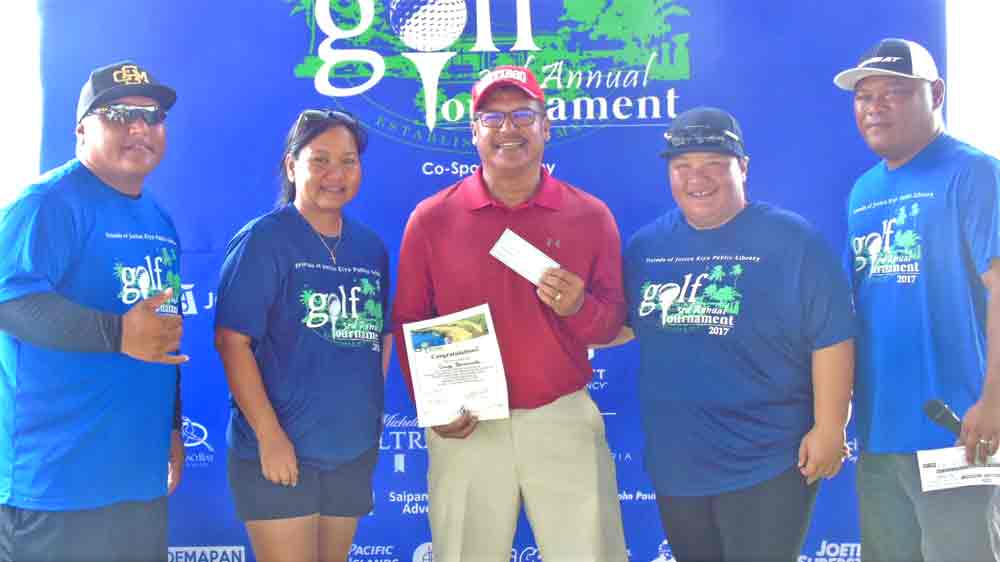 3rd Annual Friends of the Joeten-Kiyu Public Library Golf Tournament champion Nick Sablan, fourth left, poses with organizers of the double peoria competition during the award’s ceremony last Saturday at the Laolao Bay Golf & Resort.
