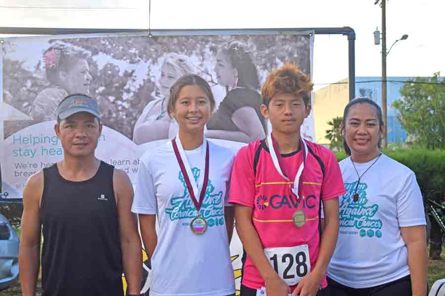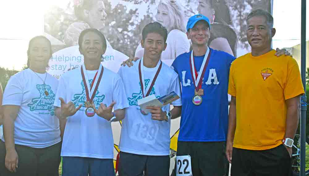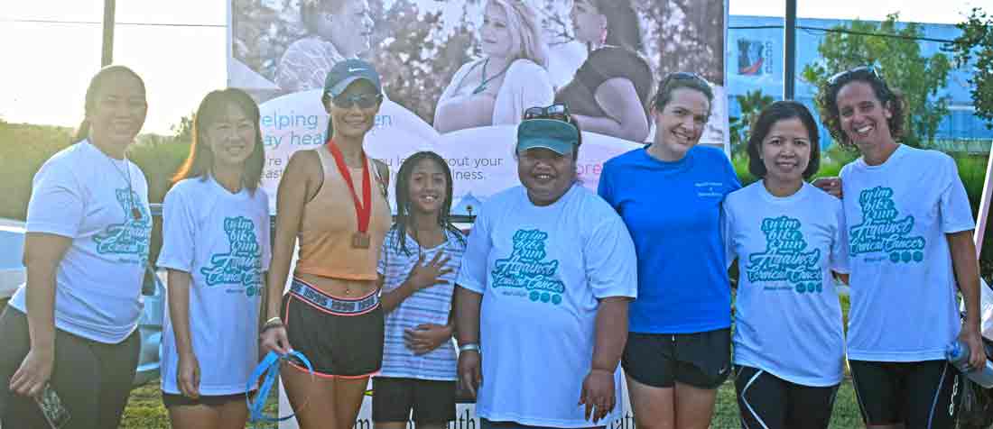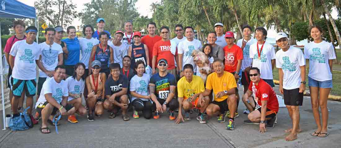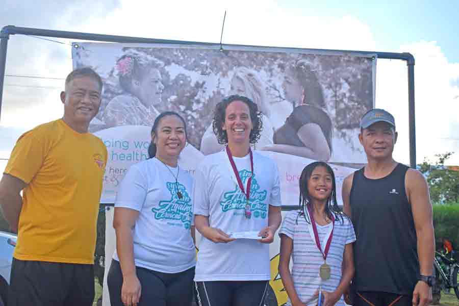 Commonwealth Cancer Association patient navigator Pat Kaipat, left, joins participants and organizers of last Sunday’s 3rd Aquathlon and 10K Pathway Run for a group photo at the Kilili Beach Park.
