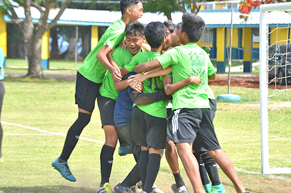 Paire Football Club 2, left, and Matansa FC players nudge each other as they run after the ball during their boys U15 /girls U16 game in the 3rd President’s Cup held early this month at the Hopwood Middle School Field.