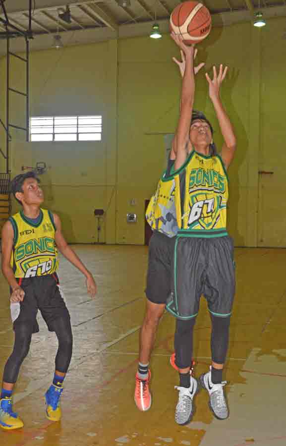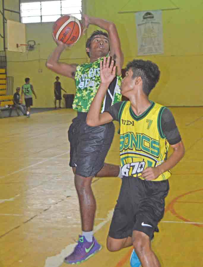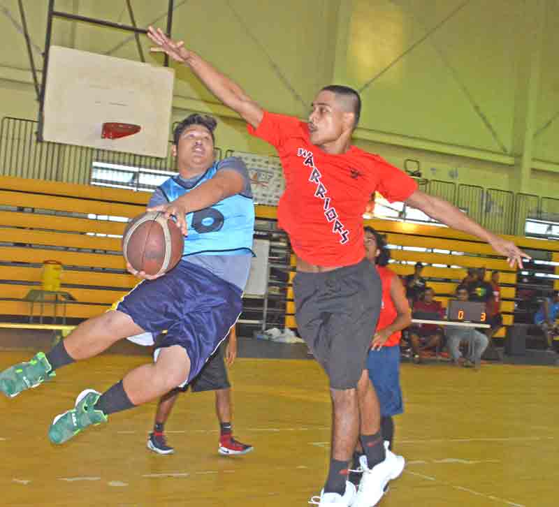 Half Gang’s Sunjoon Tenorio, left, loses his balance as he dribbles in front of Big B’s’ Aaron Ogumoro during their boys U19 division game in the Saipan leg of the 3×3 Hoopfest Marianas 2017 held early this month at the Gilbert C. Ada Gymnasium.