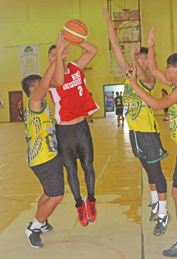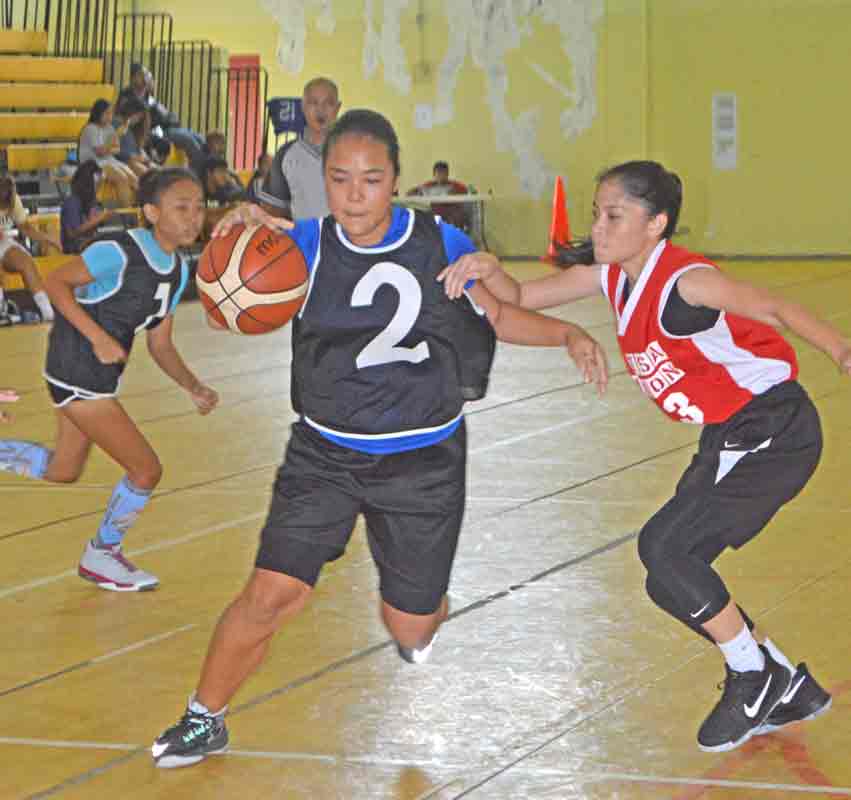 Tinian Sports Association Typhoon’s Rita King, third left, is hemmed in by Lady Ol’Aces defenders during their girls U16 title game in the 3x3 Hoopfest Marianas 2017 last Sunday at the Gilbert C. Ada Gymnasium.