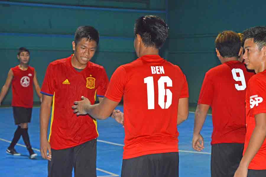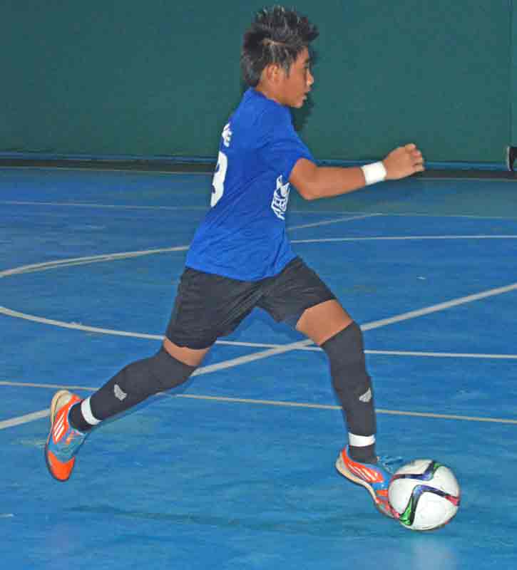 4Gives FC’s Nolan Gatharngel, right, kicks the ball in front of the defense of Saipan Elite’s Rintaro Miyawaki during their boys U16 title division game in the Saipan Soccer School’s 2017 Youth Summer Futsal Tournament last Saturday at the TSL Sports Complex.