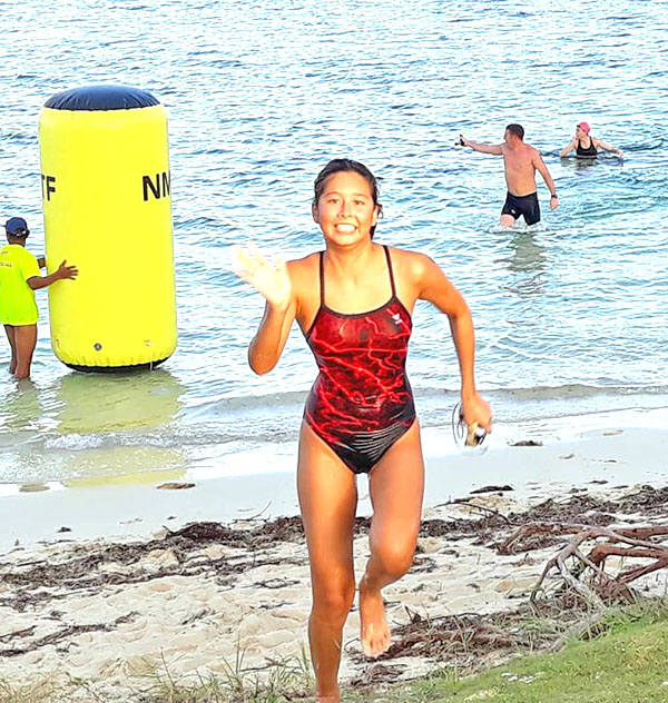 Jinju Thompson waves to the camera as she heads to the swim-run transition area at Kilili Beach during last Saturday’s 4th IT&E Saipan Aquathlon and 10K Pathway Run.