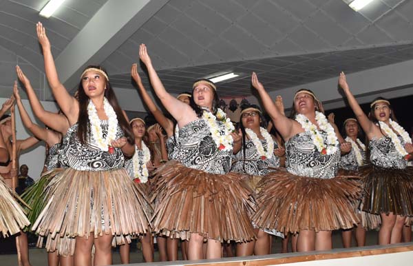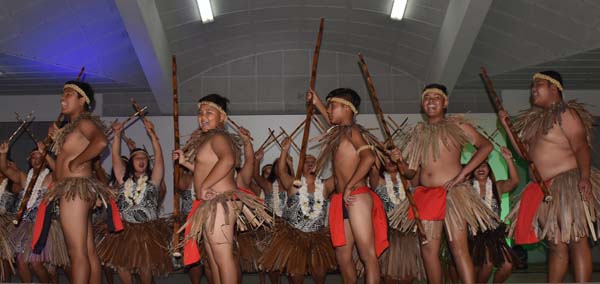 Members of the Taotao Taga Dance, Co./Guma Simiyan Manainata/Famaguon Taga-Culture perform a dance honoring the islands’ ancestors and seeking their blessings at the opening of the 63rd Tinian San Jose Fiesta Celebration last Friday night at the Antonio M. Borja Amphitheater.
