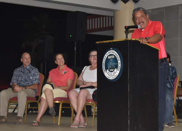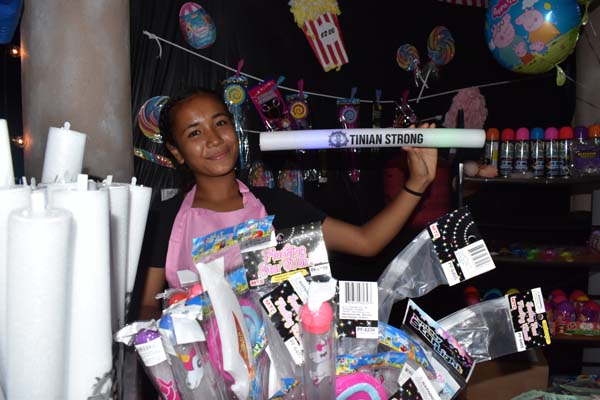 First lady Diann Torres, fourth left, reigning Miss Marianas Celine Cabrera, fifth left, join the contestants of the 2019 Miss Marianas crown for a group photo before the candidates are introduced to Tinian residents last Saturday.