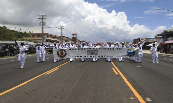 Sailors assigned to the submarine tender USS Emory S. Land participate in Guam’s annual Liberation Day Parade last July 21.