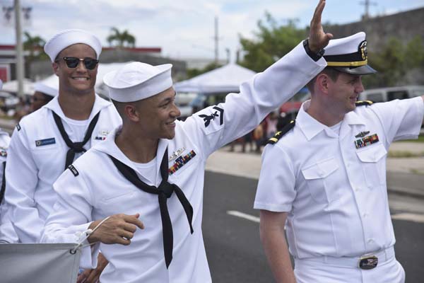 Gunner’s Mate 3rd Class Brandon Price, center, attached to the submarine tender USS Emory S. Land, waves at spectators during Guam’s annual Liberation Day Parade last July 21.