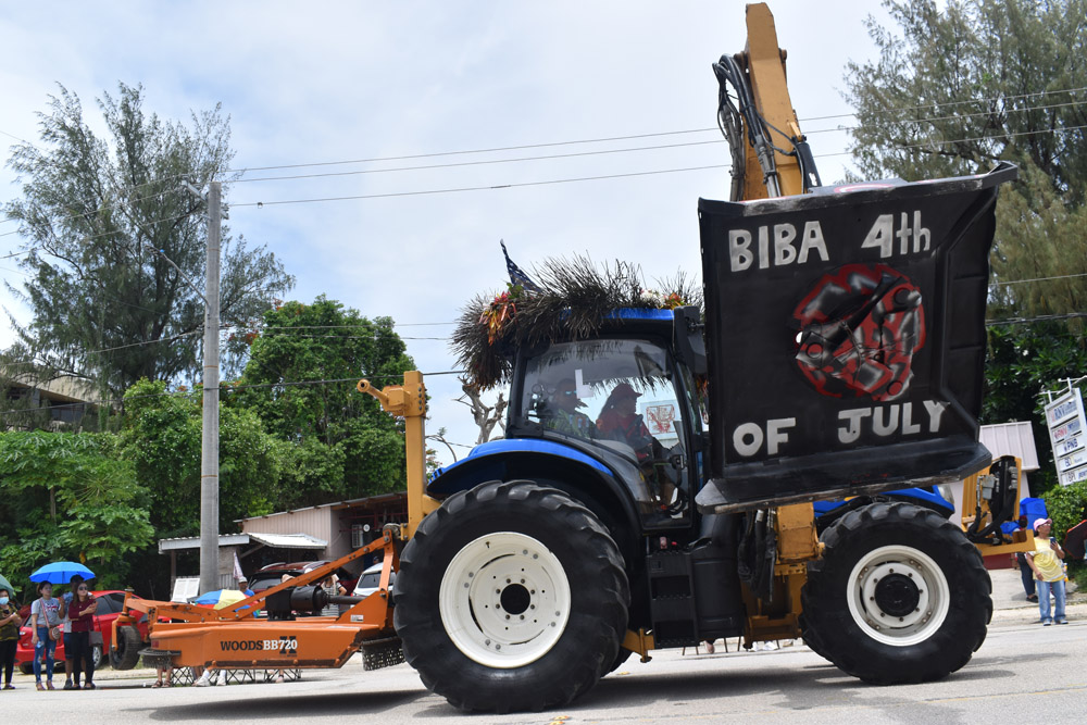 A construction equipment from DPW displays “Biba 4th of July” during the Liberation Day parade. (LEIGH GASES)