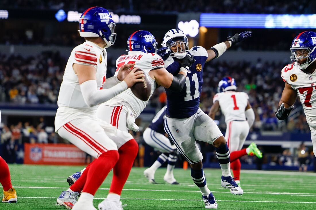 Nov 28, 2024; Arlington, Texas, USA; Dallas Cowboys linebacker Micah Parsons (11) rushes the passer during the second quarter against the New York Giants at AT&T Stadium. Mandatory Credit: Andrew Dieb-Imagn Images
