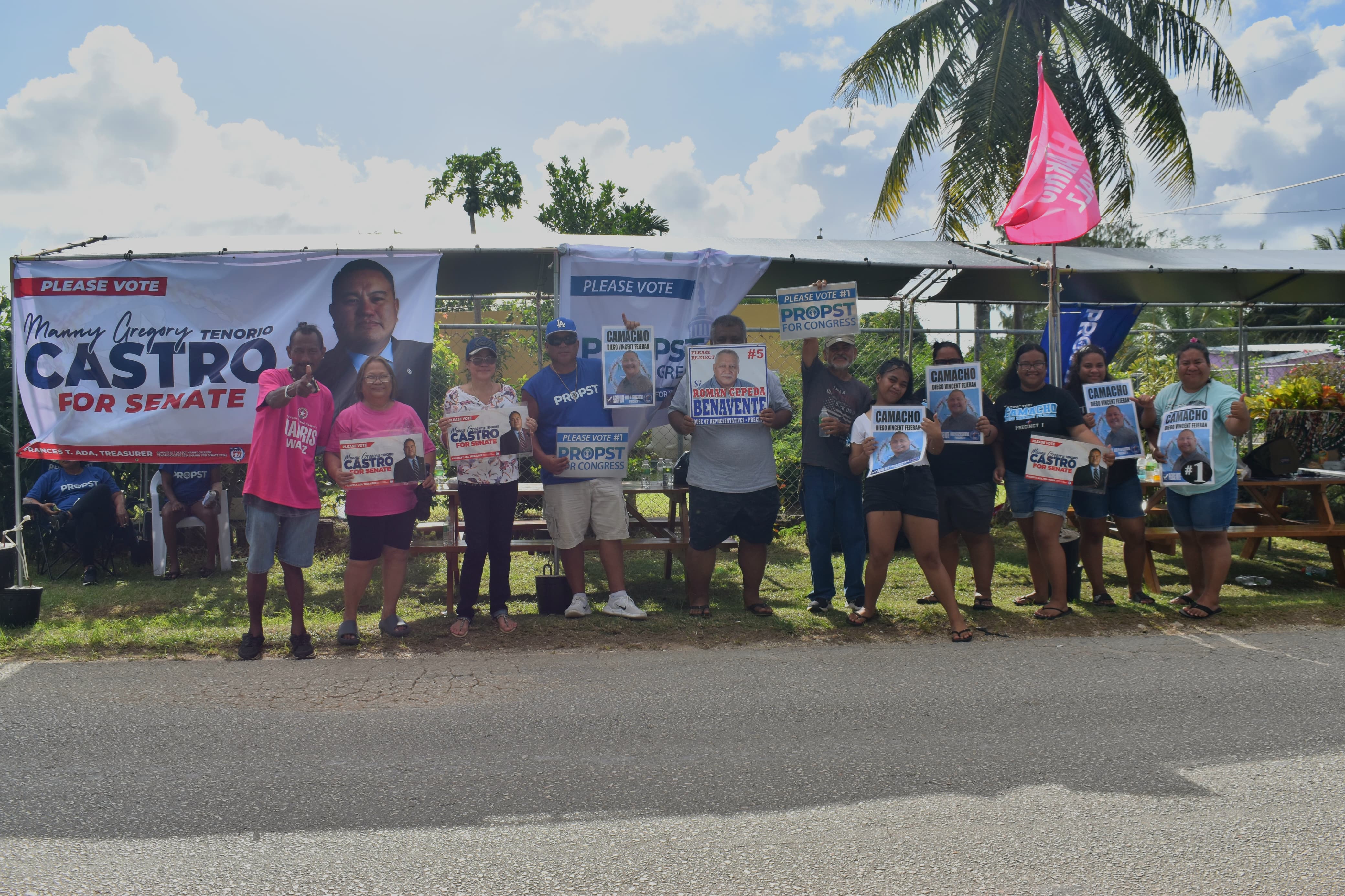 Supporters dance and smile at the Democratic Party of the Northern Mariana Islands campaign tent in Koblerville during the Nov. 5 general elections.