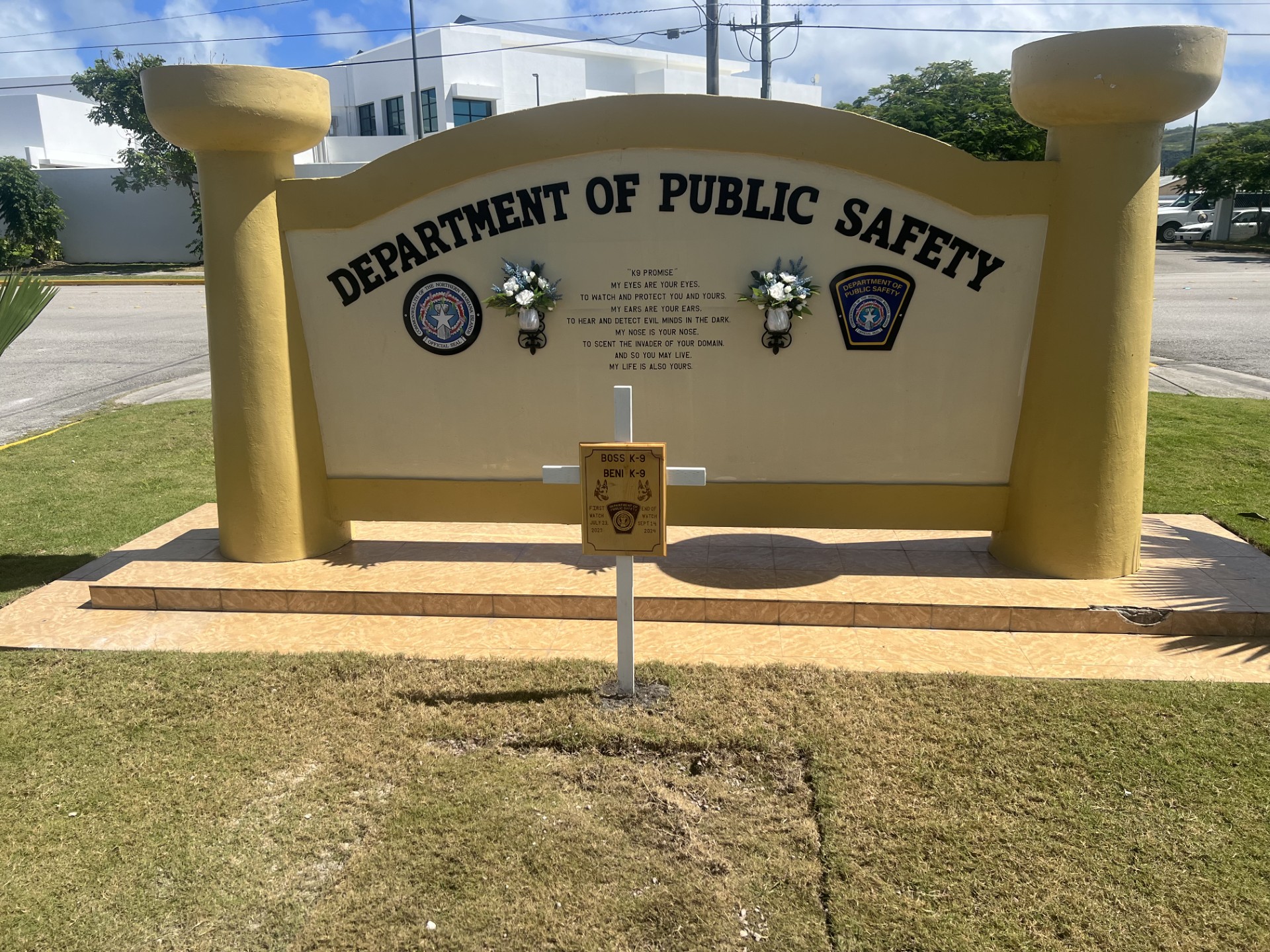 The final resting place of Department of Public Safety K-9 officers Boss and Beni at DPS headquarters in Susupe.