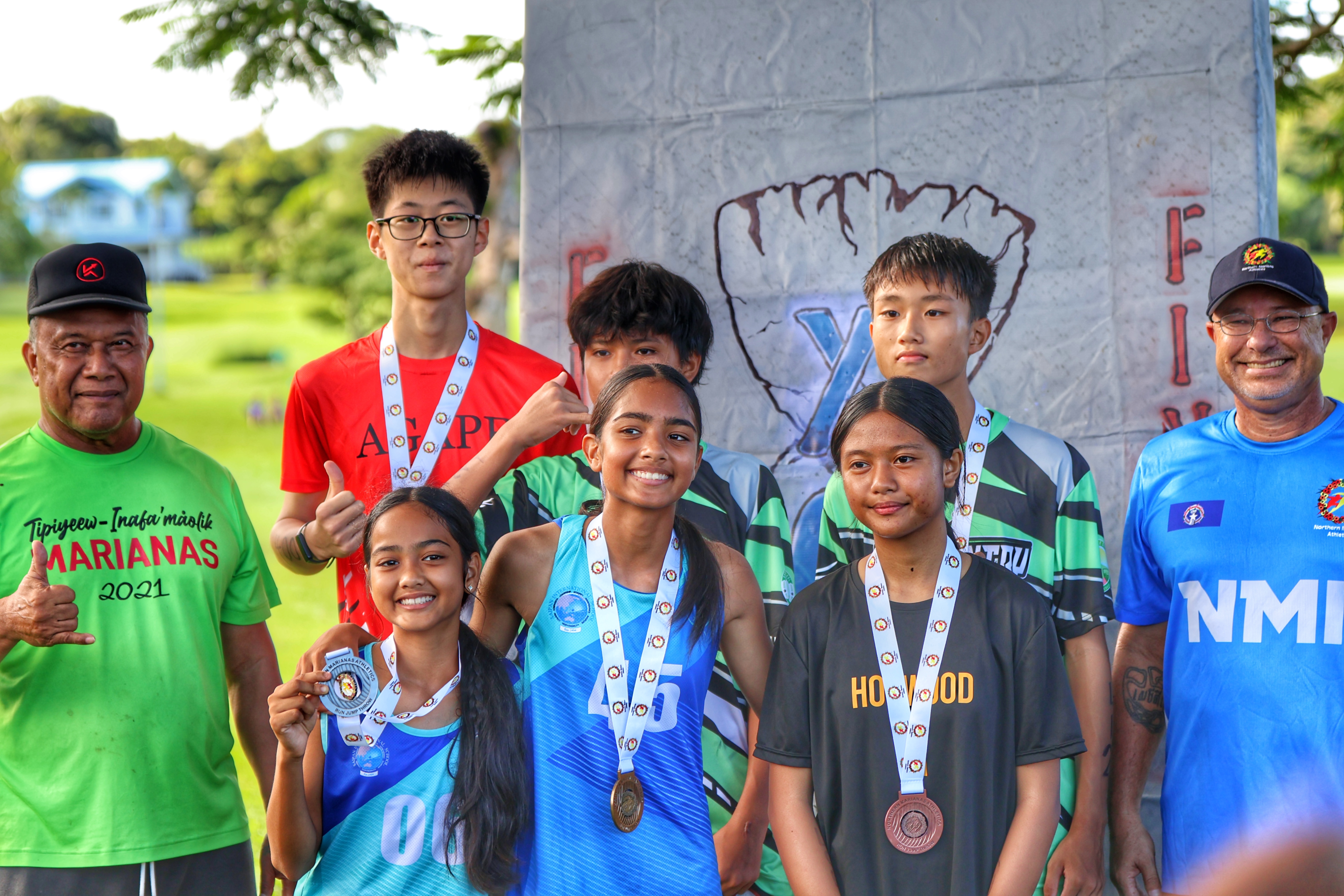 The Top 3 boys and girls in the middle school division poses with Northern Marianas Athletics president Ray Tebuteb, far left, and Board of Education secretary/treasurer Greg Borja, far right, during the awards ceremony of the PSS/NMA All Schools Cross-Country 2024-2025 championships at the Saipan Vegas Country Club last Saturday morning.