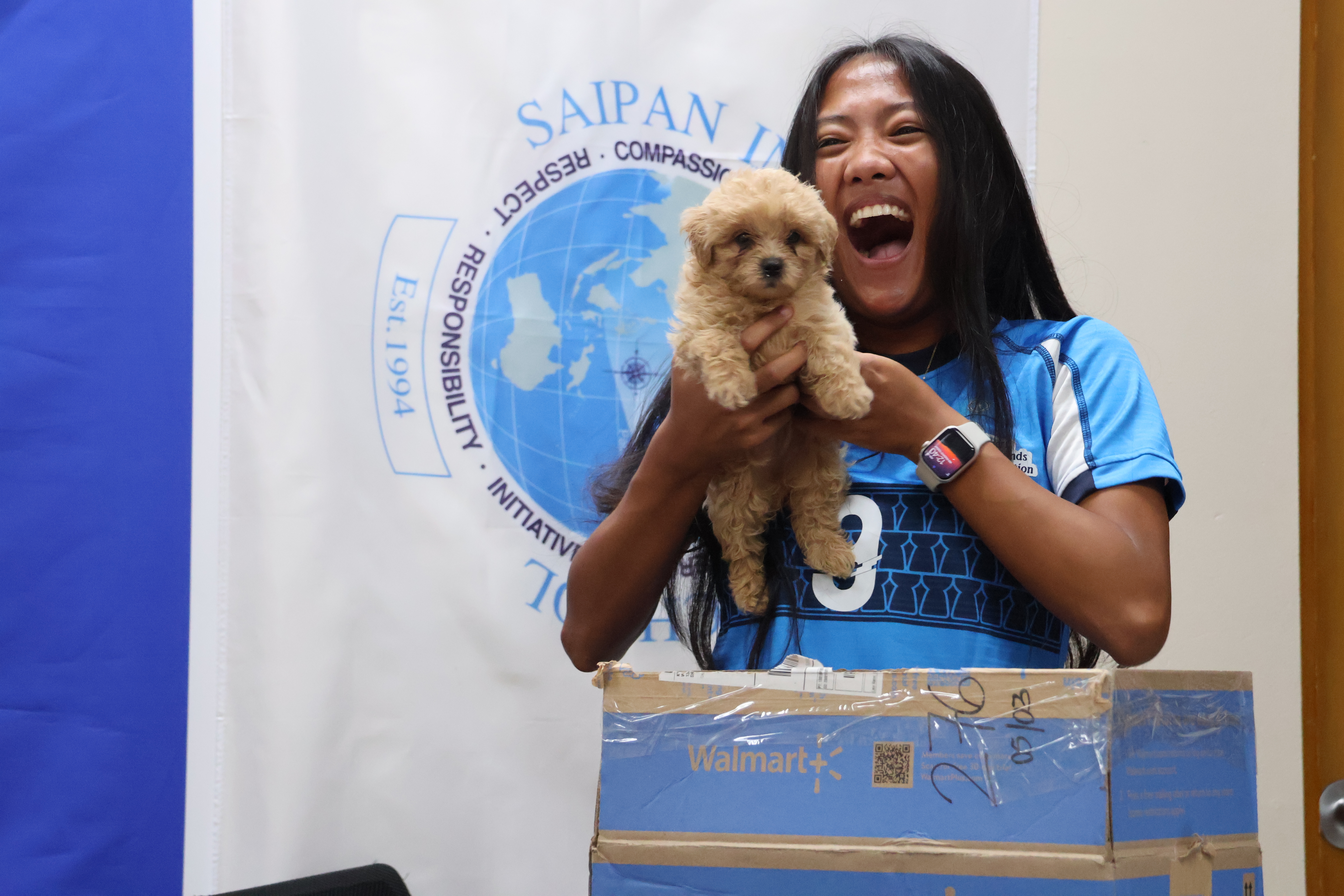 Saipan International School senior Andrei Kaithlyn Chavez holds up her puppy, Rio, that she was gifted after her signing ceremony at SIS last Friday.