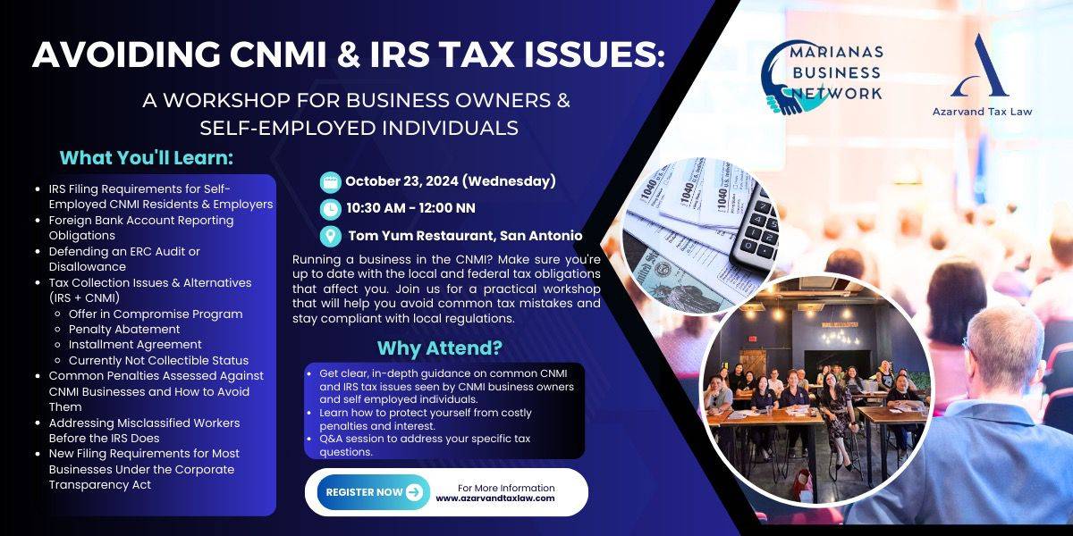 The Marianas Business Network, in partnership with Azarvand Tax Law Firm, invites business owners and self-employed individuals to a practical and informative workshop on navigating CNMI and IRS tax obligations.