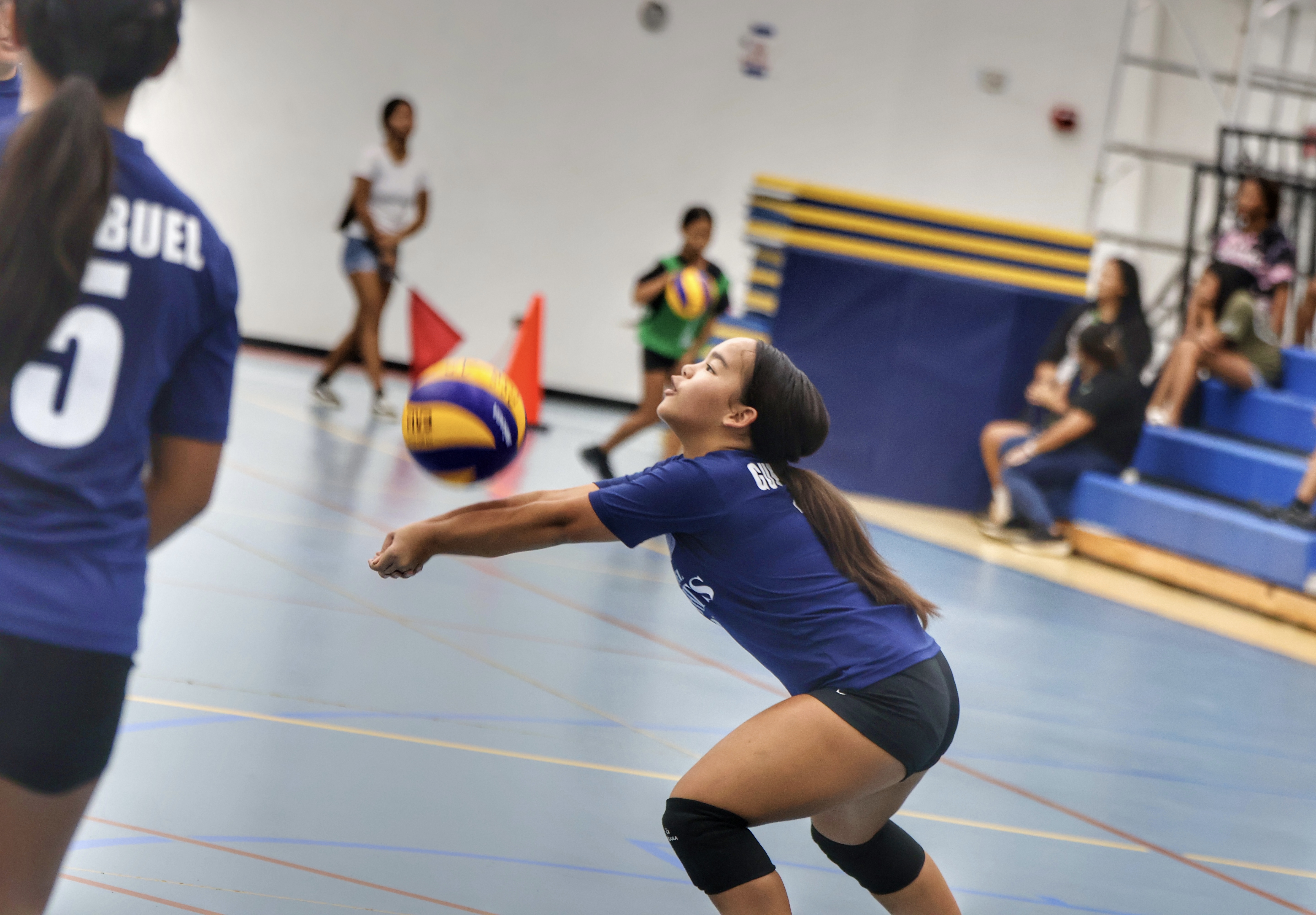 Mount Carmel School’s Mia Guerrero goes for a bump during their game in the NMIVA-PSS Interscholastic Girls Middle School Volleyball League 2024-2025 at the Marianas High School Gymnasium.