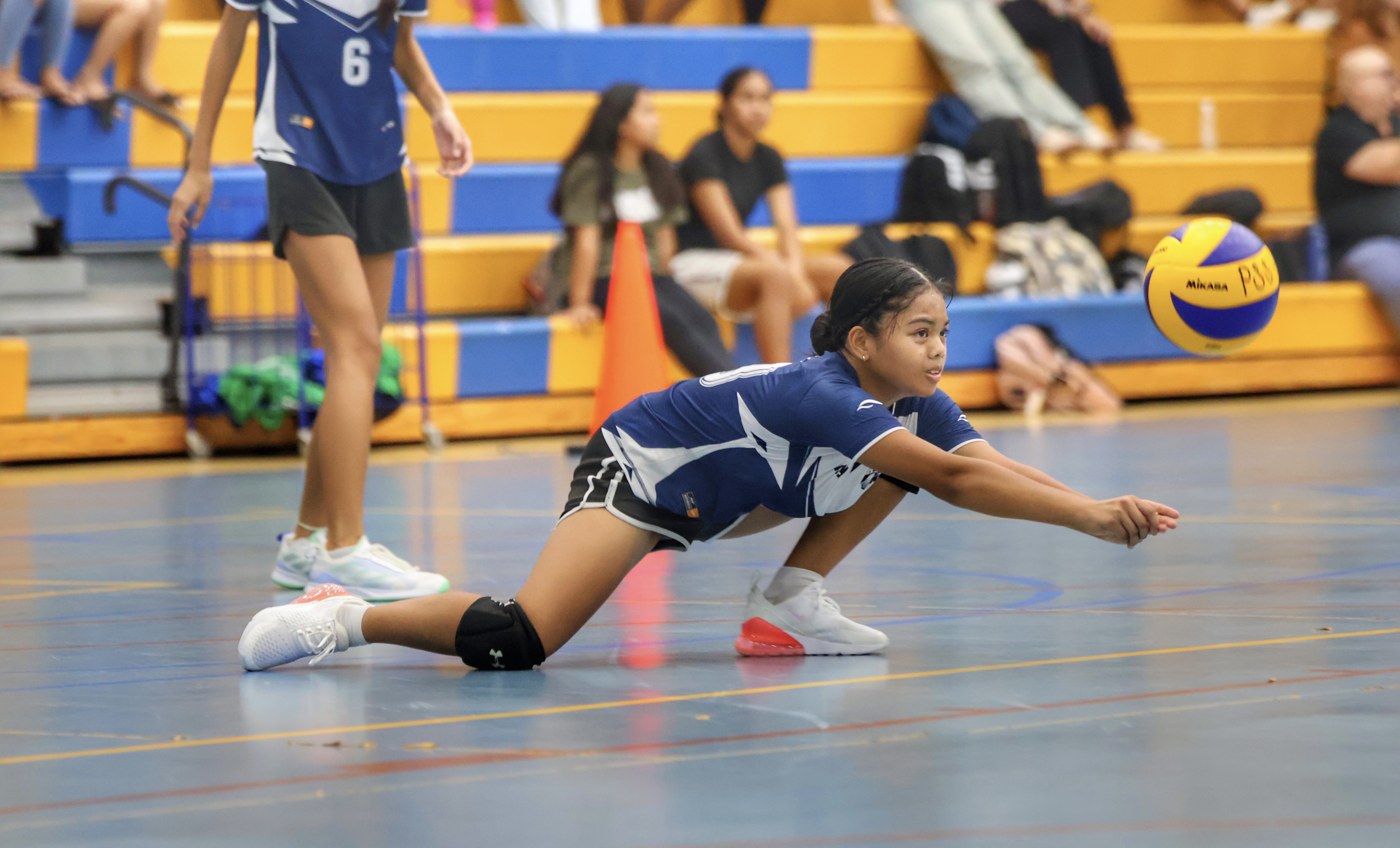 Defending champions Grace Christian Academy’s Breanna Lopez stretches for a dig during their game against Mount Carmel School in the NMIVA-PSS Interscholastic Girls Middle School Volleyball League 2024-2025 at the Marianas High School Gymnasium.